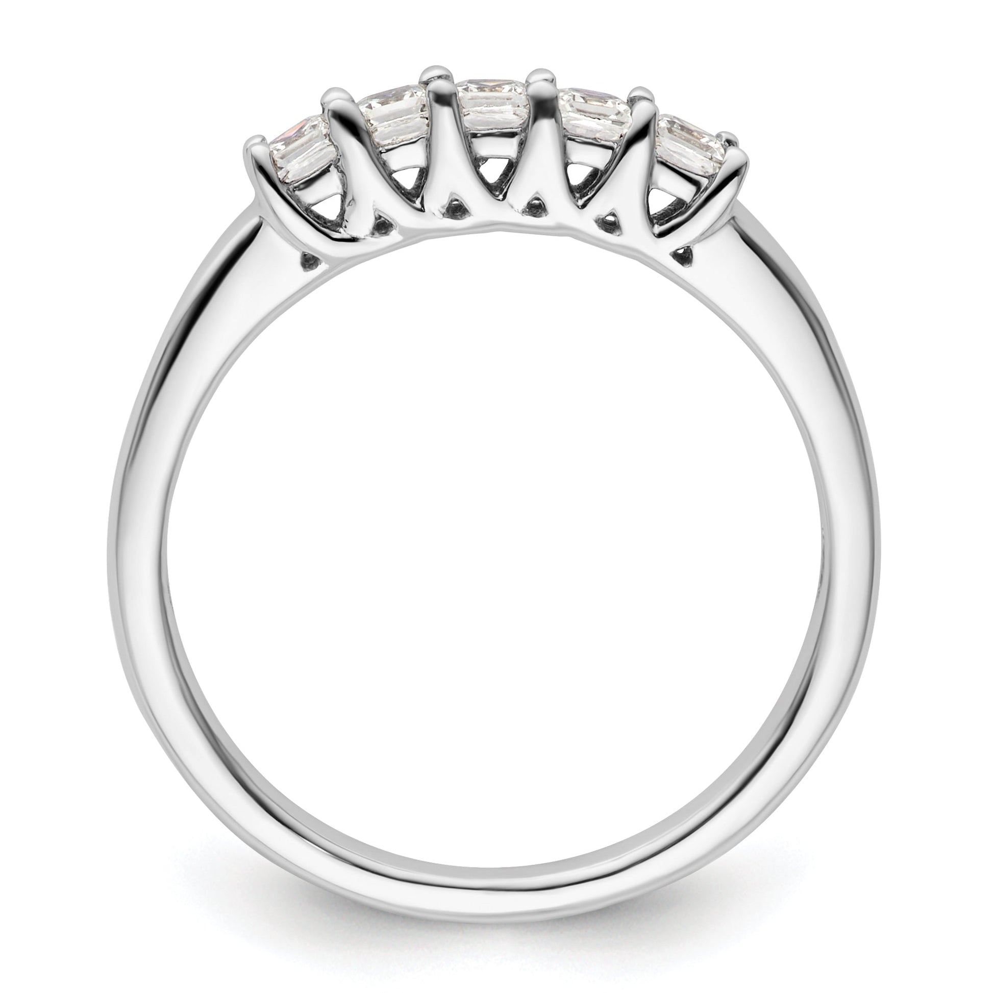This ring is complete with all stones included and features a polished finish with a closed back. The stone shapes are square with stone sizes of 2.3mm and 2.2mm. With a thickness of less than 1.5mm, this ring is perfect for those seeking a comfortable fit. While not recommended for engraving, this solid 14K white gold 5-stone wedding band ring is the perfect piece of jewelry that will be cherished for years to come.