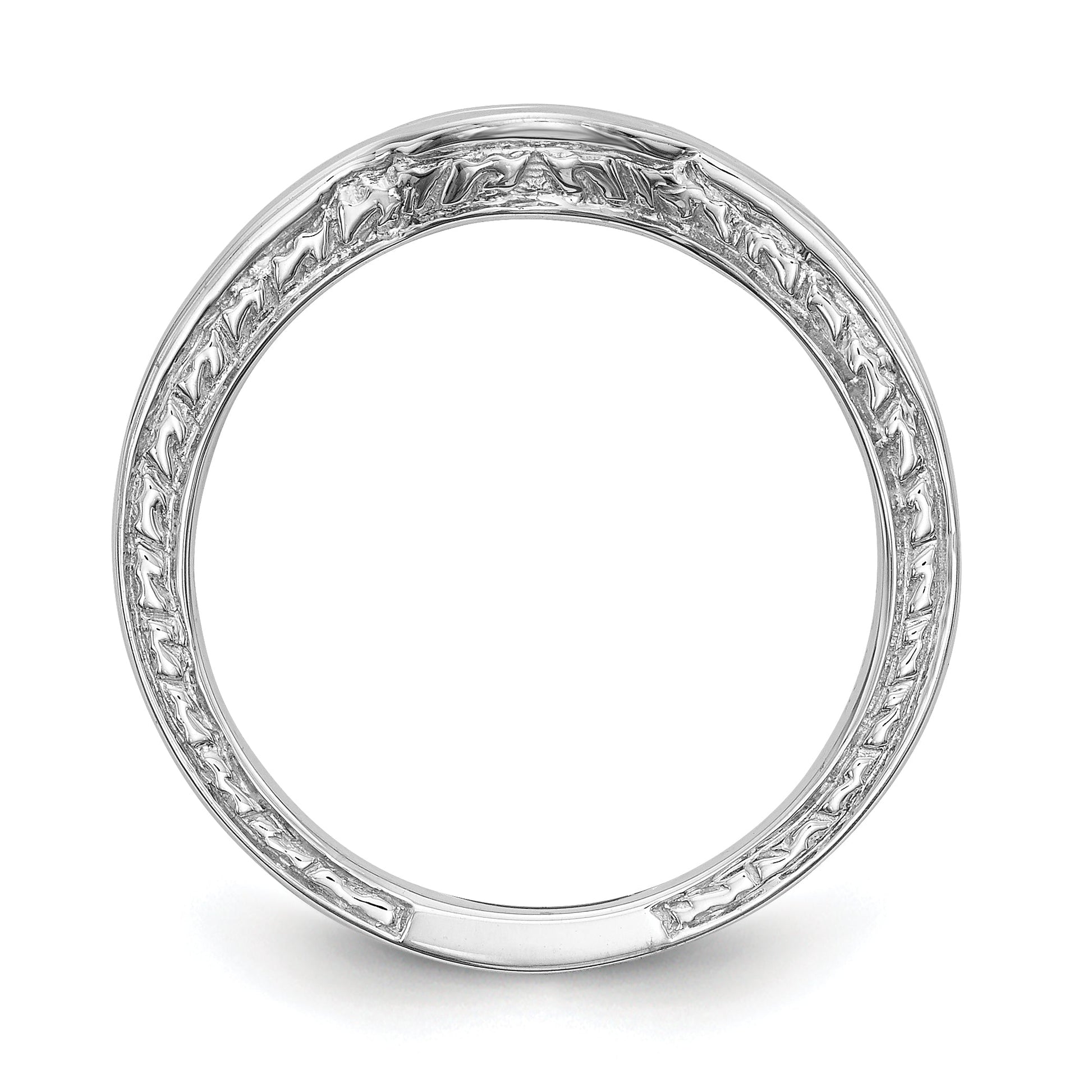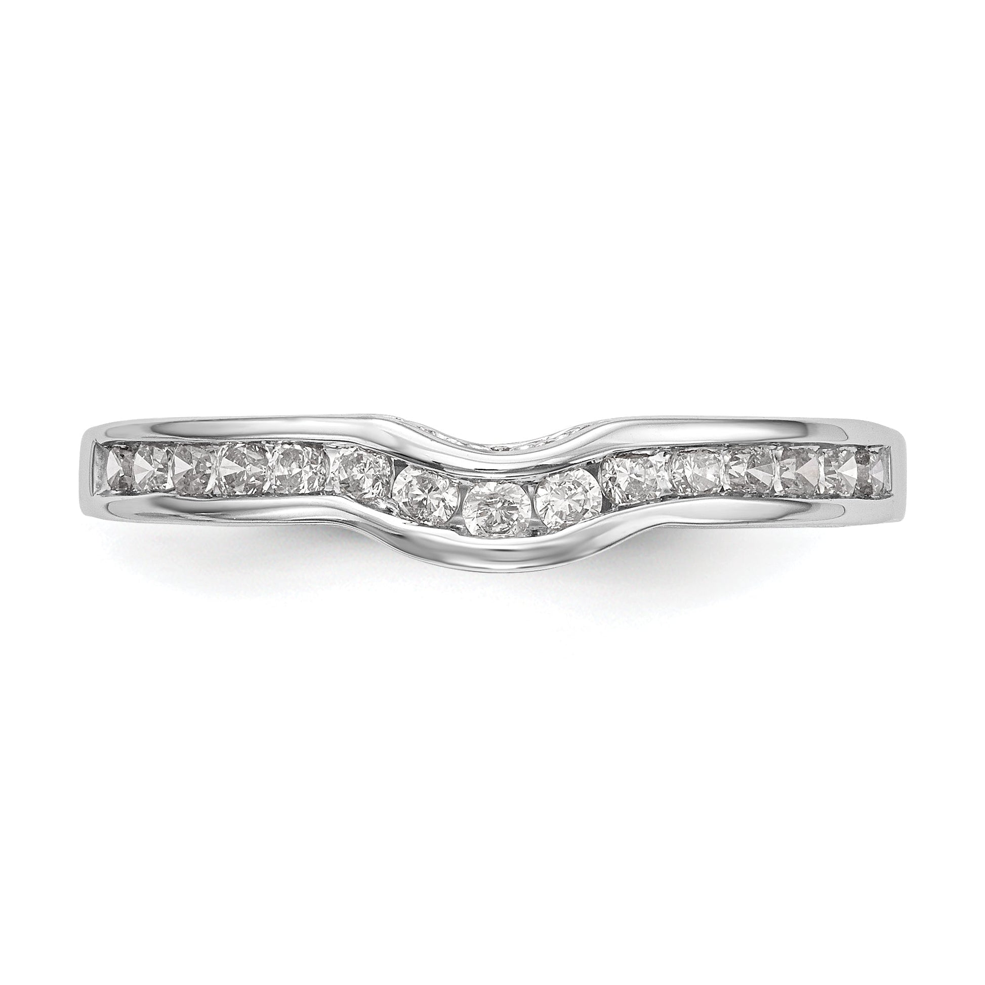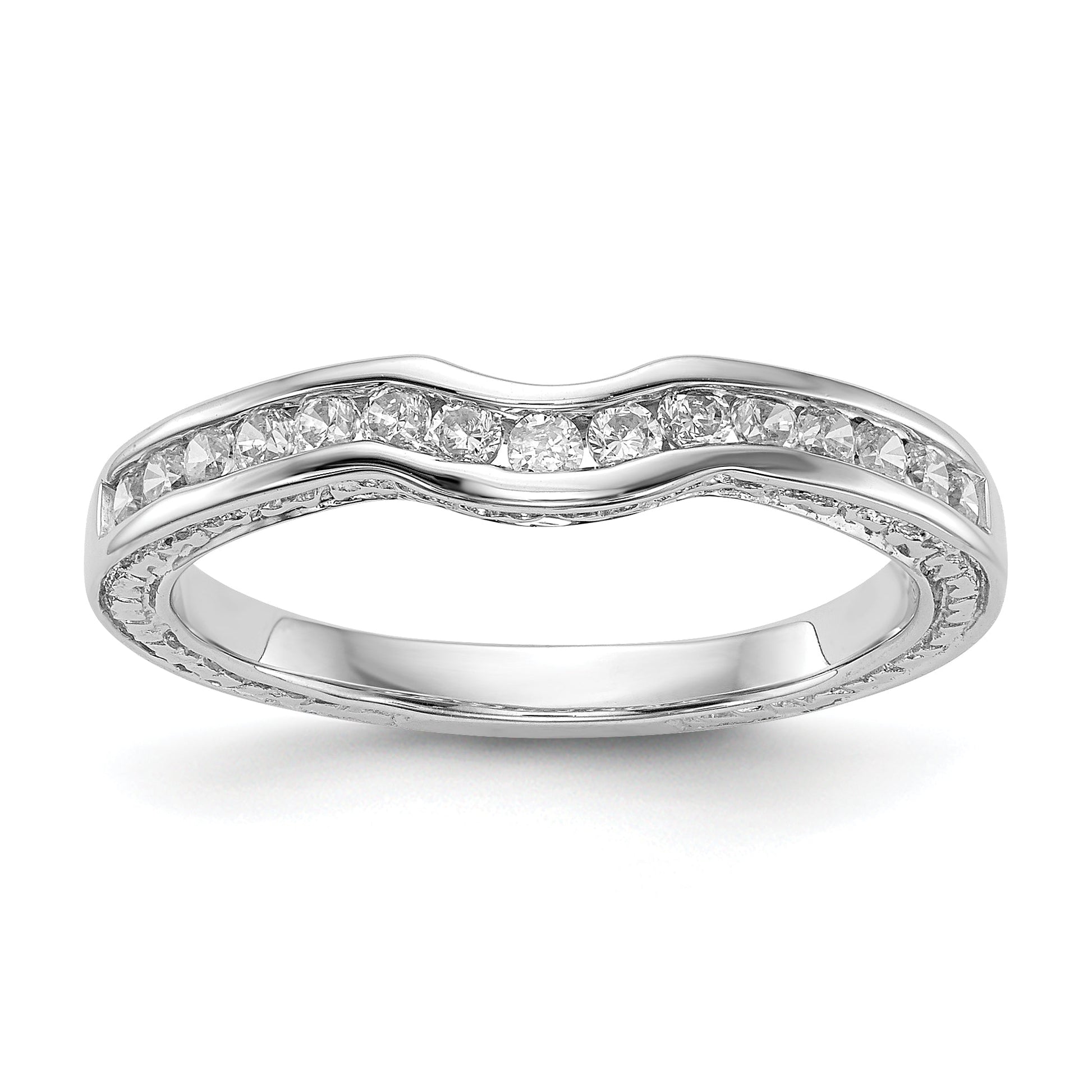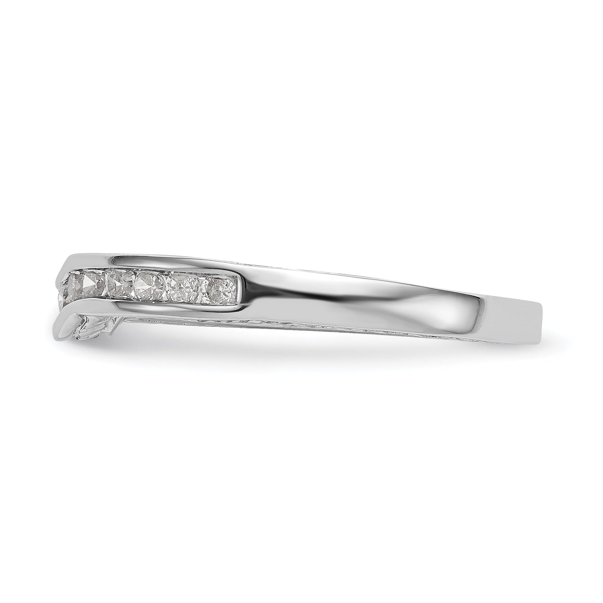 The band width is 2.75mm and it is available in sizes 6 to 8 with 0.25 sizing increments. The stone weight is 0.0225ct and it features 15 round stones measuring 1.7mm. The finish is polished and it is rhodium plated. This stunning ring is complete with all stones included and is sizeable.