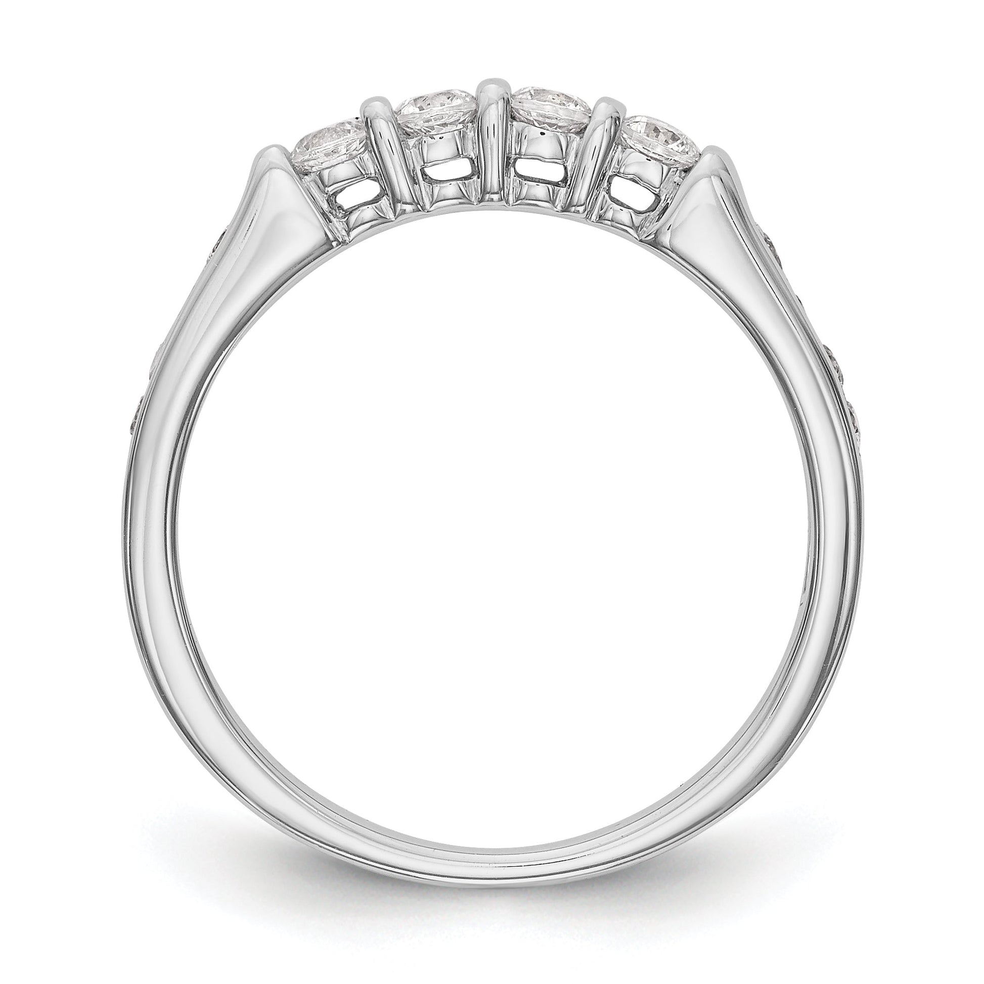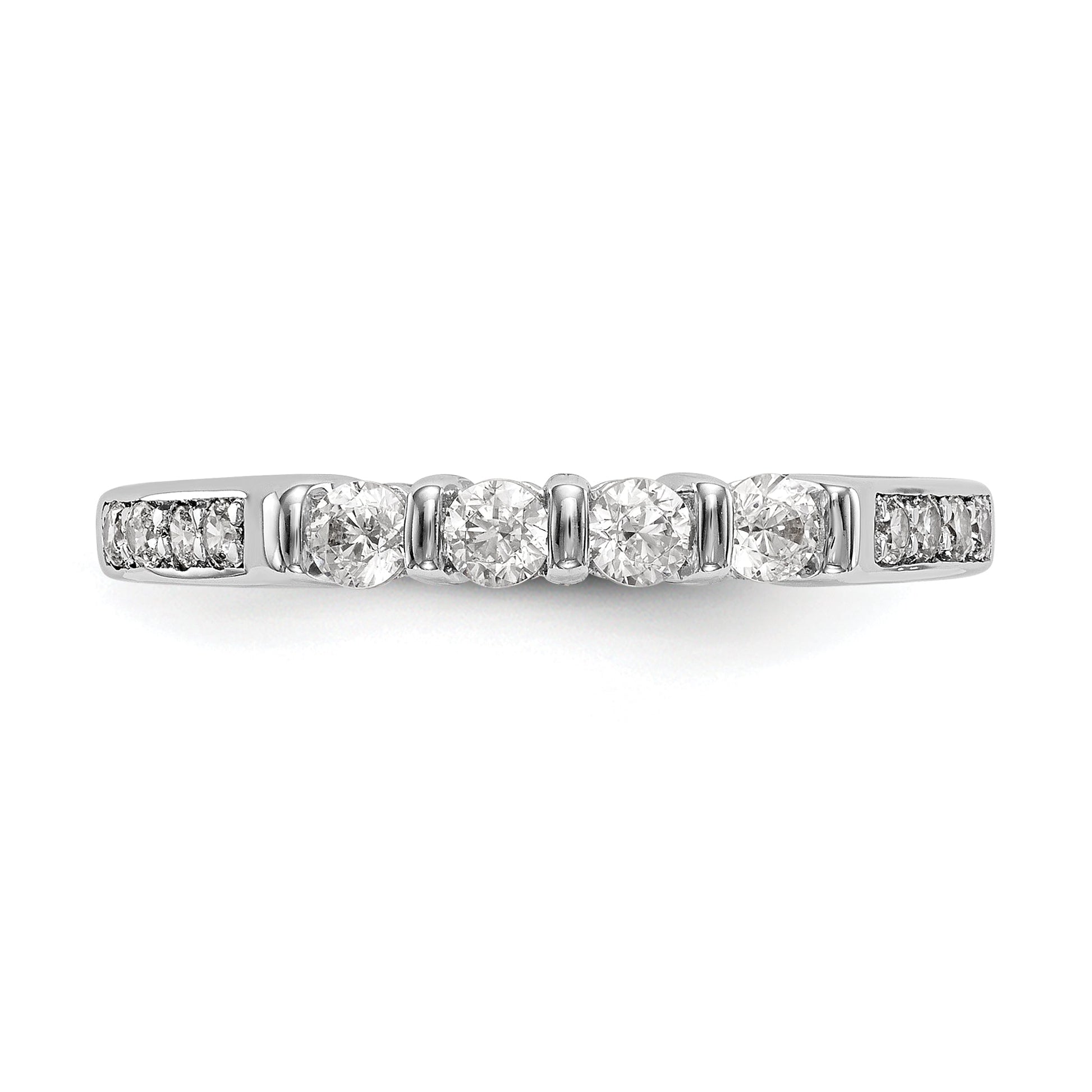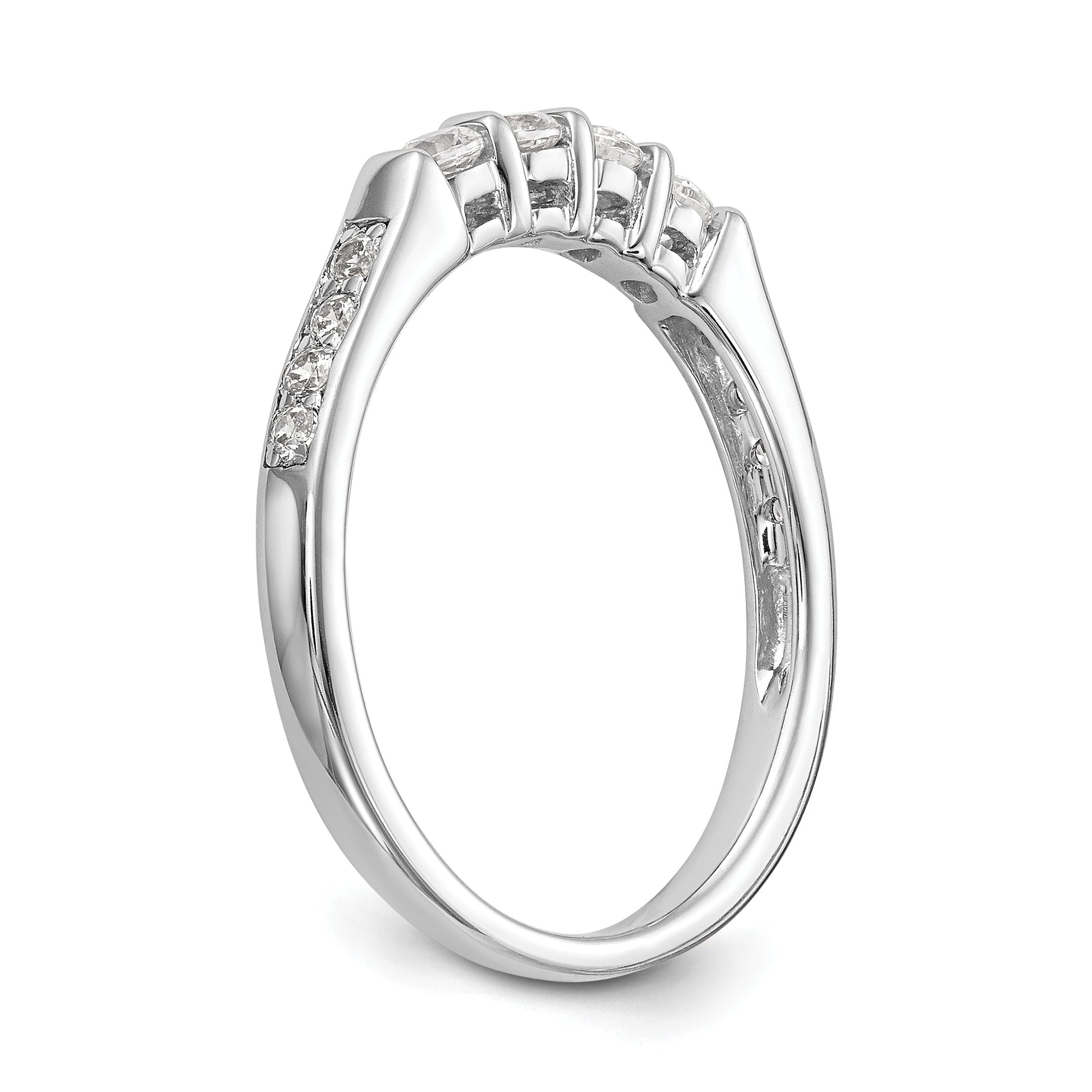 This ring features four round-cut CZ stones weighing 0.06 ct each and eight round-cut CZ stones weighing 0.015 ct each. The band width is tapered from 3 to 1.9 mm and the stone sizes are 2.4 mm and 1.5 mm. It's complete with all stones included and is sizeable from 6 to 8 in 0.25 increments. The ring is polished with a rounded edge and has an open back. It is a perfect wedding band and a stunning addition to your jewelry collection.