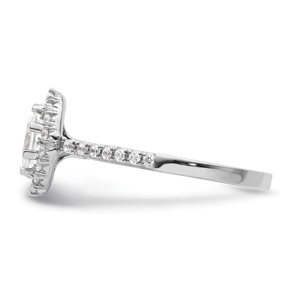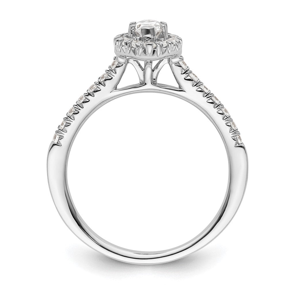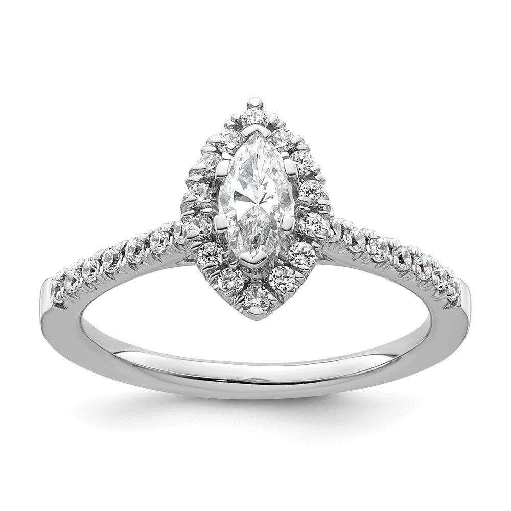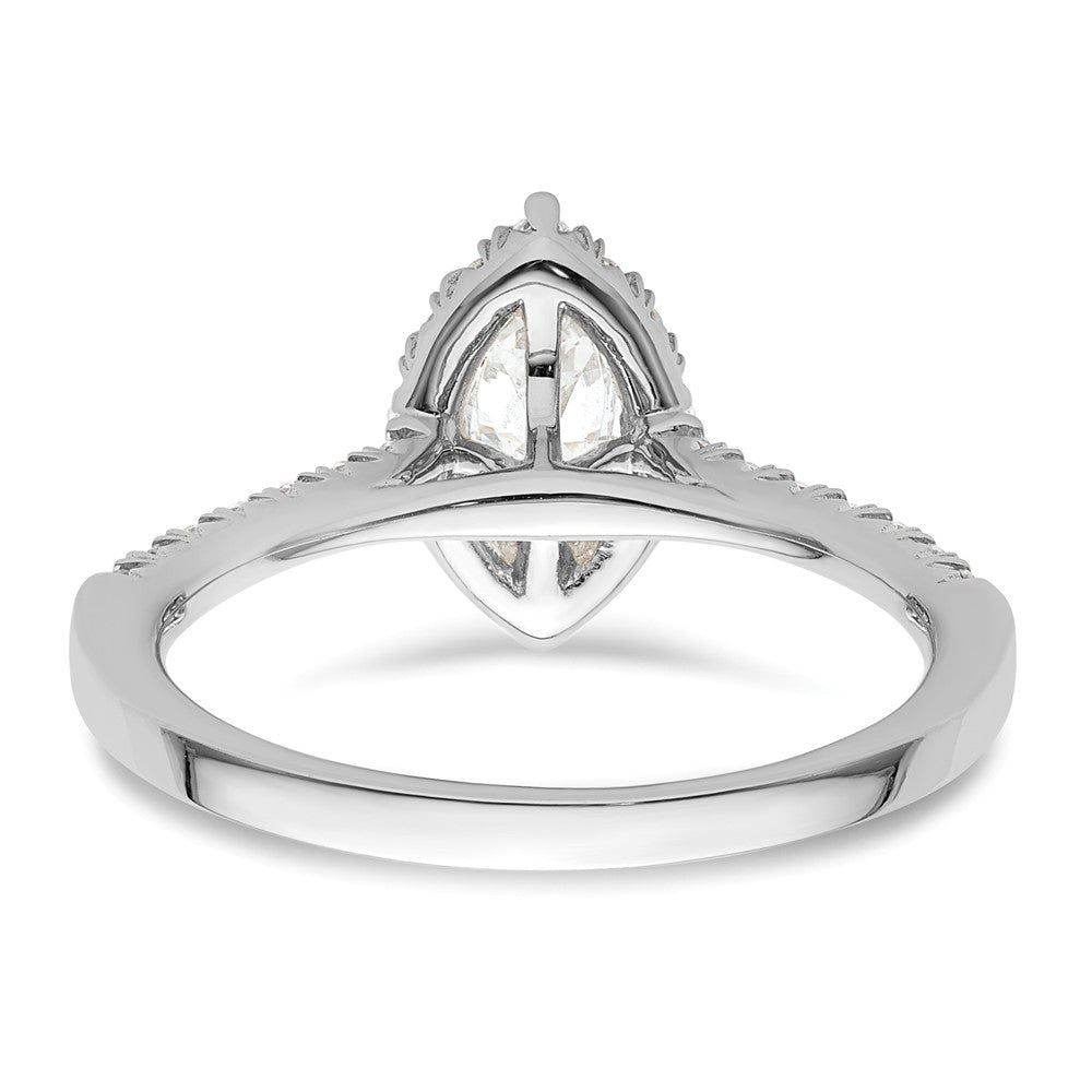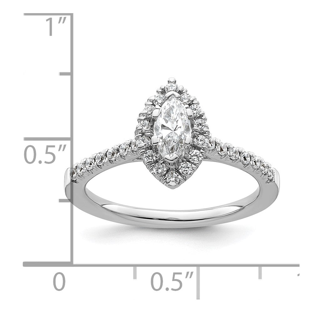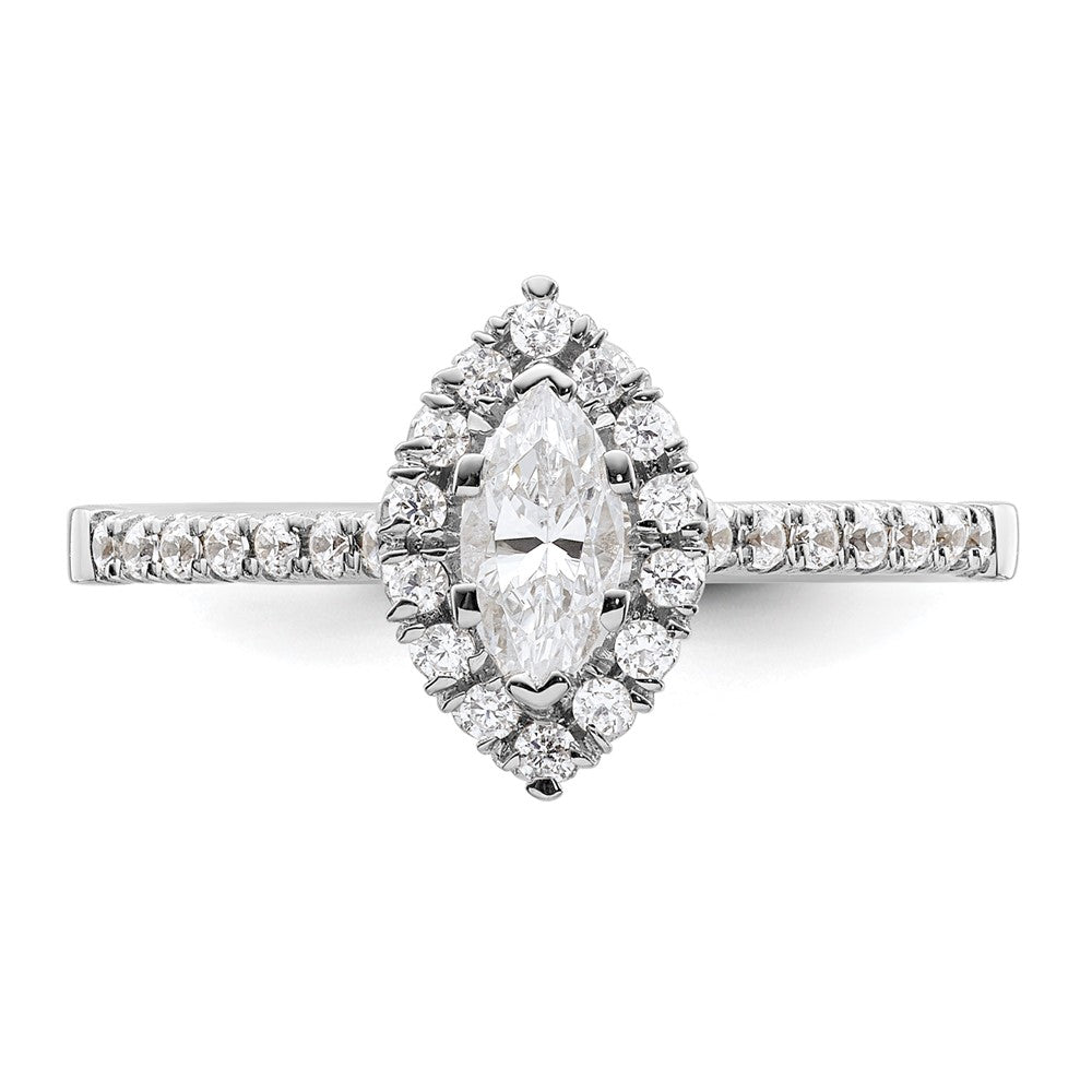 This ring is solid and complete with a semi mount (center stones not included), and can be sized from a minimum size of 6 to a maximum size of 8 in increments of 0.25. It features a marquise head with 6 prongs and 29 cubic zirconia stones totaling 0.49 ct. Its polished finish adds the perfect touch of shine to this exquisite piece of jewelry.