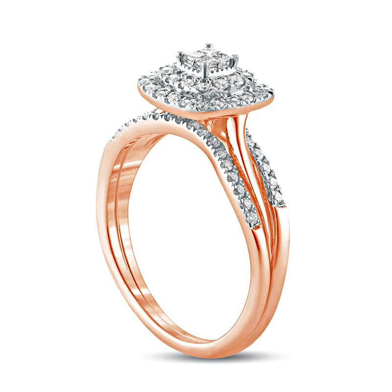 0.38 CT. T.W. Quad Princess-Cut Natural Diamond Double Cushion Frame Twist Shank Bridal Engagement Ring Set in Solid 10K Rose Gold