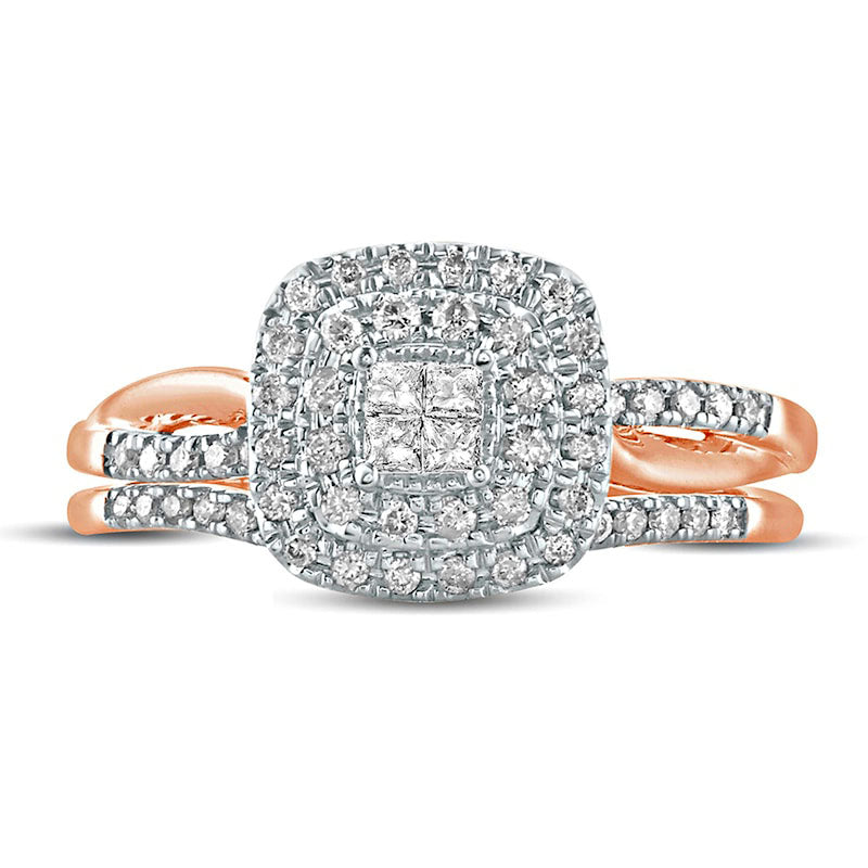 This stunning diamond bridal set is the perfect symbol of your love story. Crafted in 10K rose gold, the engagement ring features a modern design with four princess-cut diamonds that sparkle within a double cushion-shaped frame encrusted with even more diamonds. The shank boasts a sculpted design that's lined with glittering diamonds and polished to perfection. Completing this captivating set is a contoured wedding band that's adorned with diamonds for a shimmering finish. With a total weight of 3/8 ct. t.w. and a brilliant buffed luster, this bridal set is a breathtaking choice that perfectly represents your unique romance.