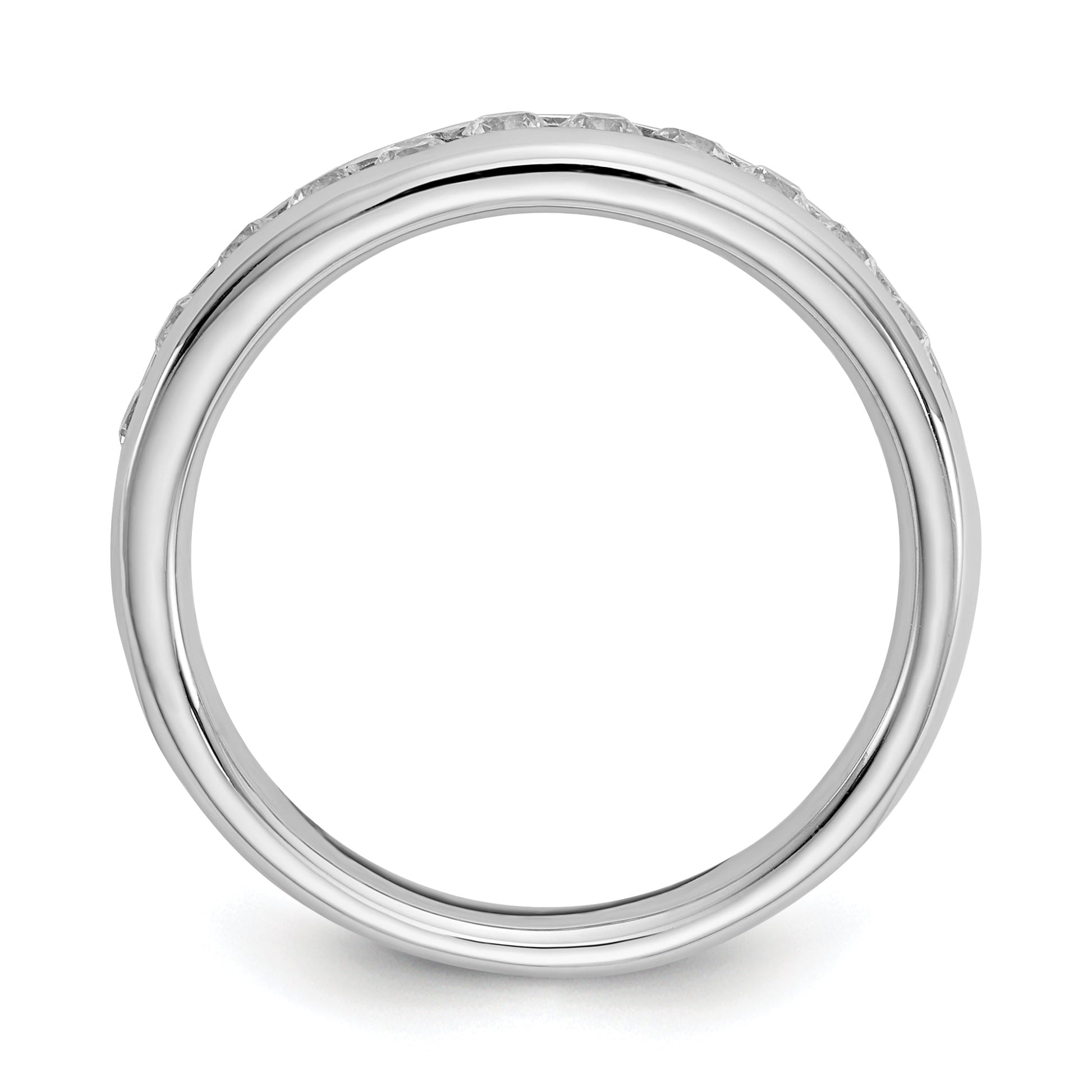 This is a 14K white gold wedding band ring with 11 cubic zirconia stones. The CZ stones are high quality and set by skilled jewelers. The ring comes with a 30-day money-back guarantee and a gift box. It can also be made with real diamonds if you want to upgrade. This ring is a great gift for special occasions like birthdays, anniversaries, weddings, and holidays. The band is 3.8 to 3.2 mm wide and has a polished finish. The ring is also available in yellow or rose gold.