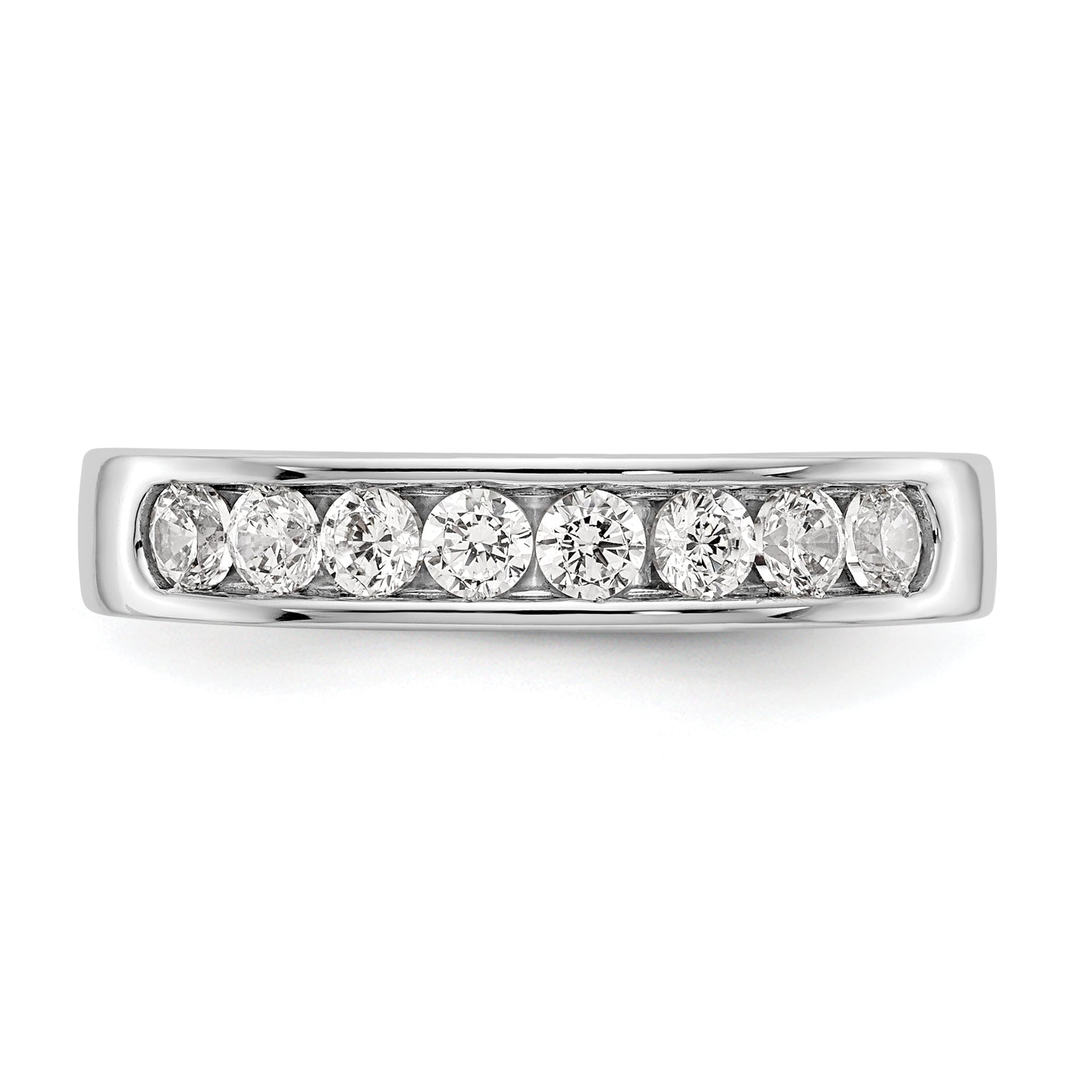 This ring has a band width of 3.5mm and is sizeable, with a thickness of less than 1.95mm. The 8 stones are round, each measuring 2.5mm in size, with a total weight of 0.059ct. They are set in a polished rhodium-plated solid gold setting, giving it a sleek and elegant look. This jewelry piece, sold by unit, is complete with all stones included and features a closed back. It is also versatile, perfect for any occasion or outfit.
