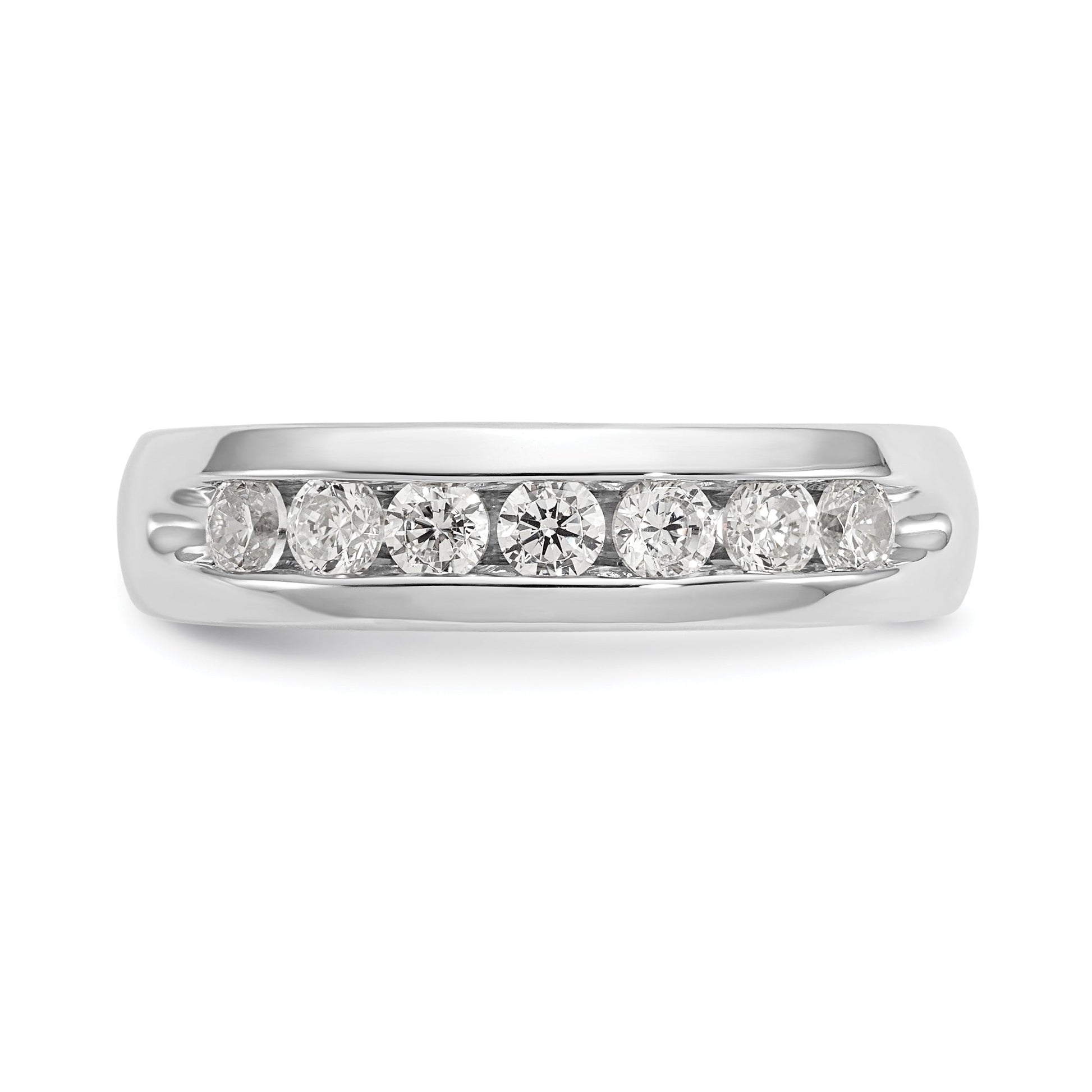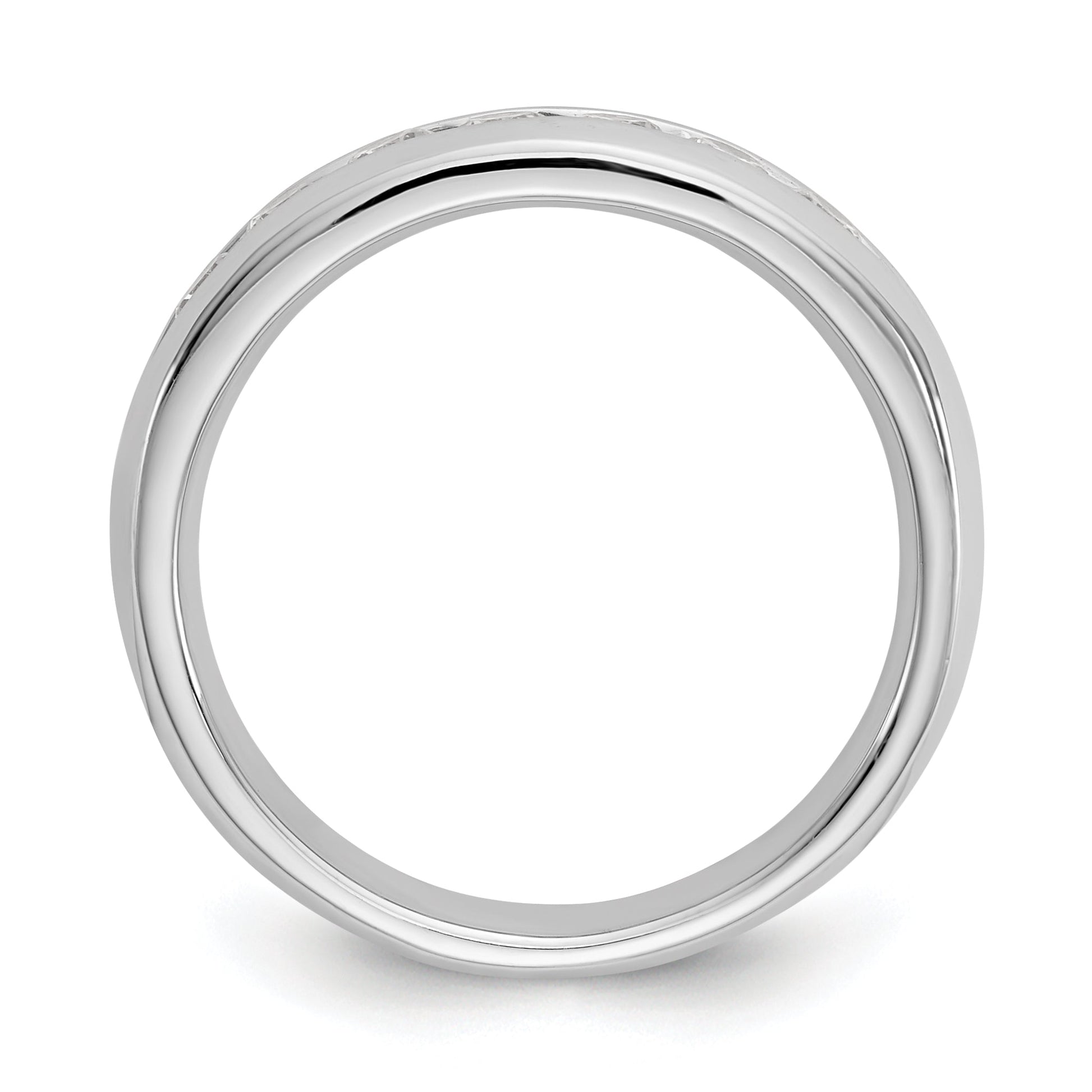 The ring's dimensions are as follows Finish - Polished, Stone Type - CZ (Cubic Zirconium), Stone Quantity - 7, Plating - Rhodium, Band Width - 5 to 4.1 mm (tapered), Stone Clarity - I1 (AA), Size (Minimum) - 6, Size (Maximum) - 8, Sizing Adjustment Increment - 0.25, Feature - Solid, Manufacturing Process - Casted, Completeness - Complete (all stones included), Sizeable - Yes, Stone Shape - Round, Stone Size - 2.6 mm, Thickness - < 2 mm, Engravable - Not Recommended, Product Type - Jewelry, Jewelry Type - Rings, Sold By Unit - Each, Material - Primary Color - White, Ring Type - Wedding Bands, and Feature 2 - Closed Back. The stone creation method is synthetic.