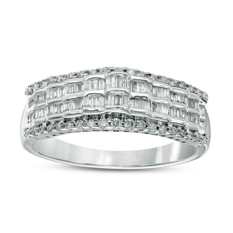 Upgrade her fashion sense with this stunning layered diamond ring. Made from sleek 10K white gold, this tiered design consists of two rows of dazzling baguette-cut diamonds that add depth and dimension. There is a line of tiny round diamonds along both the top and bottom of the band. With a total weight of 1/2 ct. of diamonds and a gorgeous polished shine, this four-row ring is captivating and sure to attract attention.