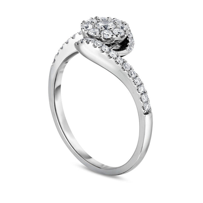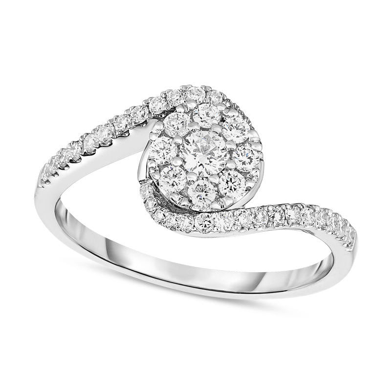 Declare your affection with this stunning diamond engagement ring that radiates for eternity. Expertly crafted in 10K white gold, the luminous design showcases a sparkling round composite of diamonds nestled within a slender shank encrusted with dazzling diamonds. With a total weight of 1/2 ct. t.w. of diamonds, this bypass engagement ring exudes elegance and sophistication, and its brilliant buffed luster only adds to its charm. Perfect to embody your commitment, this 10K white gold bypass engagement ring is a jewel to treasure forever.