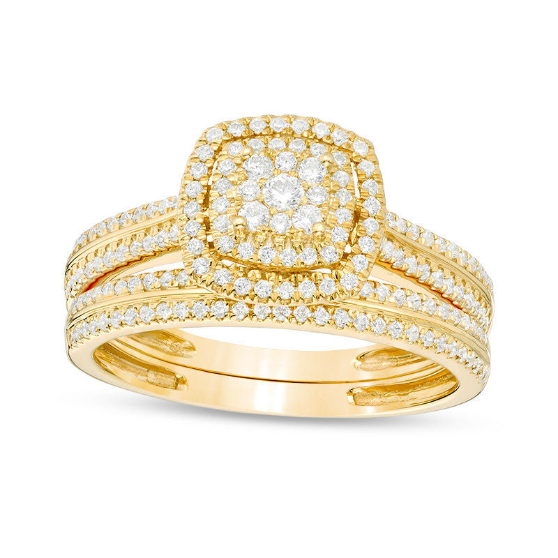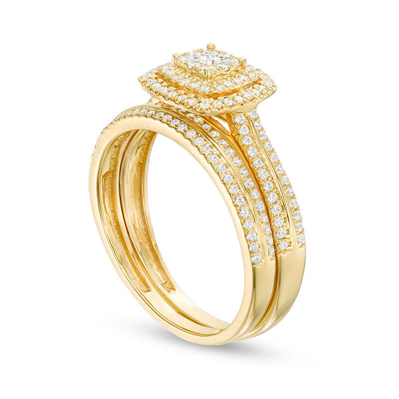 This beautiful diamond bridal set is sure to amaze and impress. Made from luxurious 10K gold, the engagement ring showcases a stunning cushion-shaped composite of diamonds, framed by two halos of even more dazzling diamonds. The split shank is also lined with three rows of shimmering diamonds, adding to the overall brilliance of the piece. Complete your special day with the matching diamond wedding band, and make your vows in style. Boasting a total of 1/2 ct. t.w. of diamonds, this bridal set sparkles and shines with a brilliant buffed luster. A comfortable, yet elegant choice for a lifetime of love.