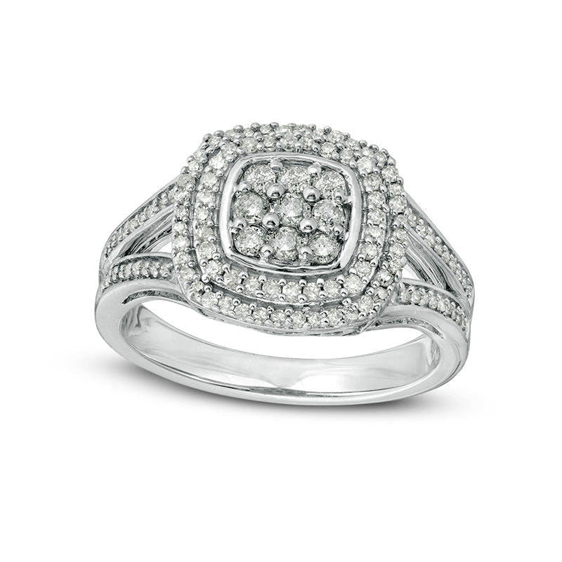 Looking for a stunning diamond engagement ring that will make her heart skip a beat? Look no further than this gorgeous piece. Designed in luxurious sterling silver, it boasts a magnificent 1/2 CT. T.W. composite diamond cushion-shaped centerpiece, surrounded by a sleek polished edge for maximum impact. The ring also features two dazzling frames of diamonds, along with a diamond-covered split shank for added beauty and sophistication. With its radiant luster and flawless craftsmanship, this ring is the perfect way to express your love and commitment to your special someone. Please note that sterling silver rings cannot be resized after purchase.