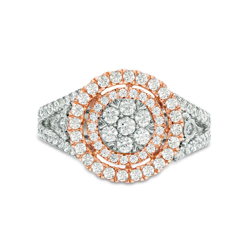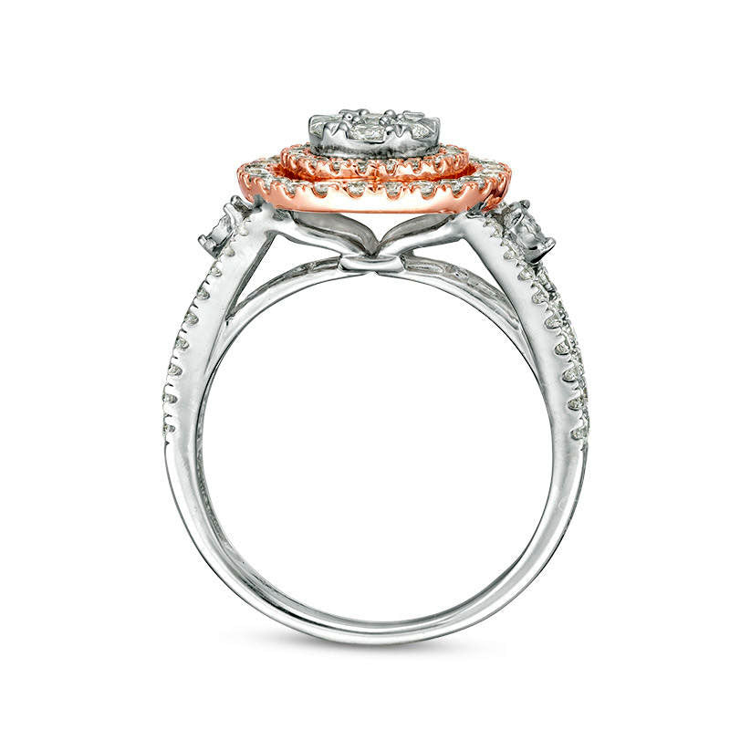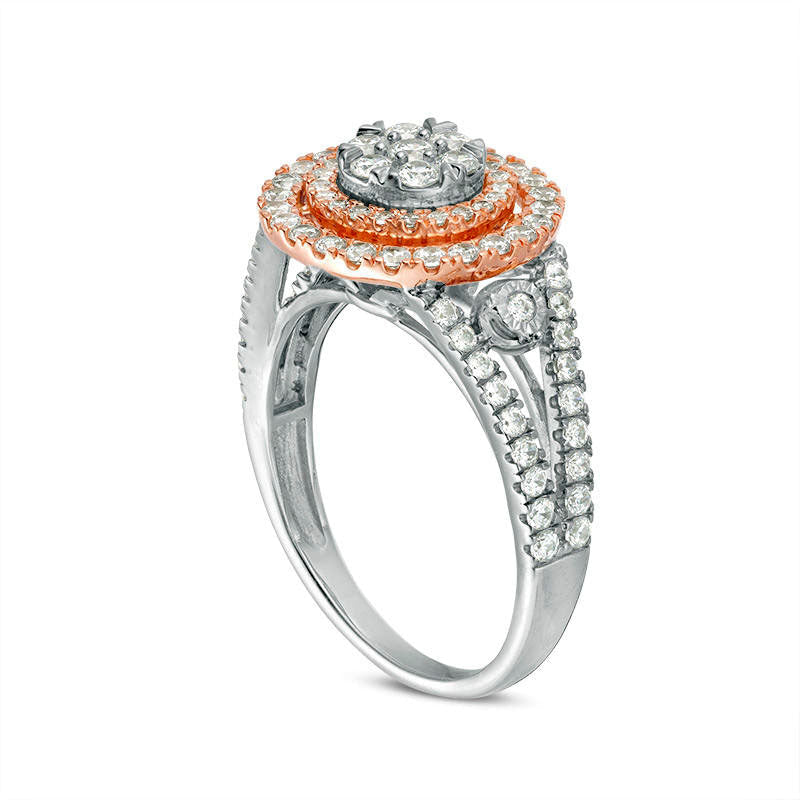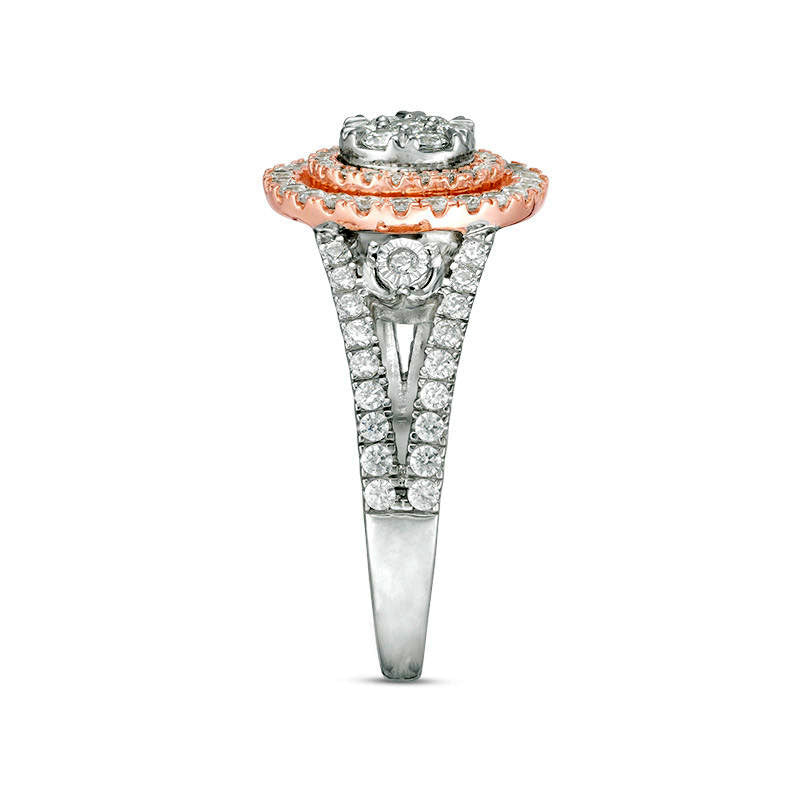 Celebrate your commitment with this radiant diamond engagement ring. Expertly crafted in 10K two-tone gold, this enchanting piece showcases a captivating flower-shaped composite of dazzling diamonds in white gold at the center, enveloped by dual halo frames of diamonds in rose gold. Enhancing the centerpiece, a single diamond in white gold adorns each side. The exquisite split shank in white gold is also adorned with diamonds. Glittering with 1/2 ct. t.w. of diamonds and a brilliant polished finish, this engagement ring is the perfect way to win her heart.