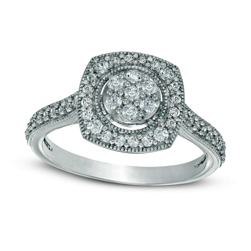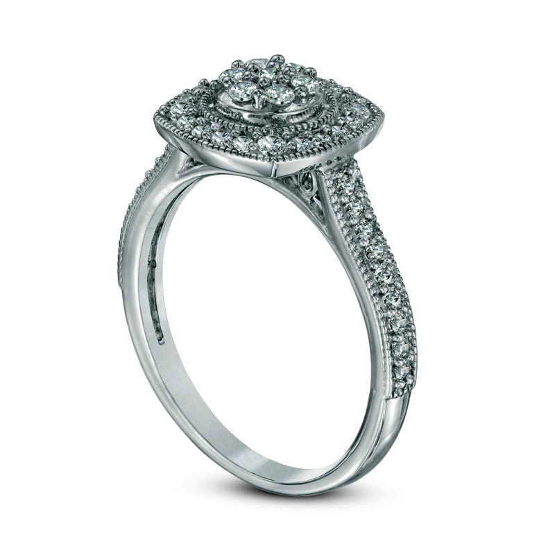 Express your timeless love with this vintage-inspired diamond engagement ring that is sure to capture her heart. Created in lustrous 10K white gold, this stunning ring boasts an heirloom-look design featuring a charming flower-shaped cluster of diamonds at the center. The center composite is framed by a dazzling halo of smaller accent diamonds in a sparkling cushion-shaped pattern, while the slender shank of the ring is adorned with additional diamonds that add a touch of extra sparkle to the piece. Exquisitely detailed with intricate milgrain accents, this breathtaking ring has a total diamond weight of 1/2 ct. and is finished with a gleaming, polished shine, making it the perfect choice for a comfort-fit engagement ring.