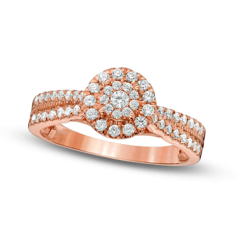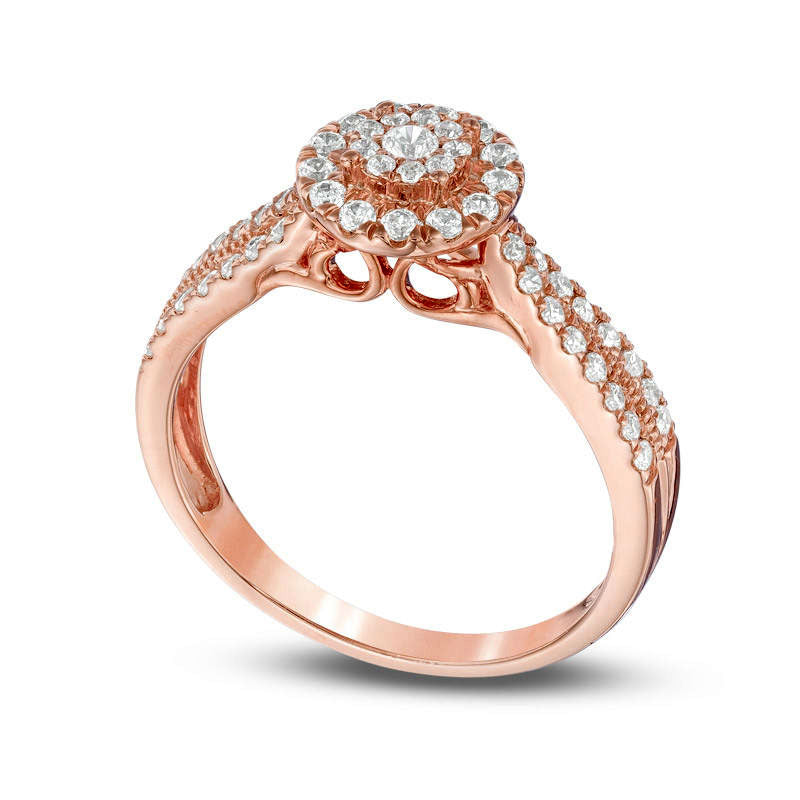 This captivating engagement ring boasts an alluring aesthetic that your loved one is sure to cherish. Crafted from precious 10K rose gold, it exudes understated sophistication. A stunning diamond center composite is delicately encircled by a sparkling, diamond-studded frame for a truly mesmerizing effect. The split shank features a double row of accent diamonds that lends additional shine and radiance to the overall design. With a total weight of 1/2 ct. t.w., this comfortable-fit ring is polished to a luminous, bright shine, making it an unforgettable piece.
