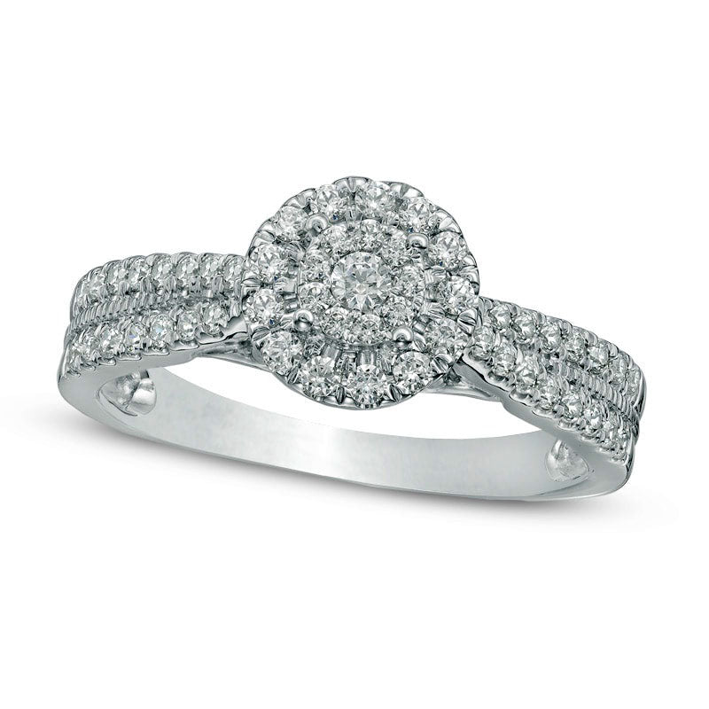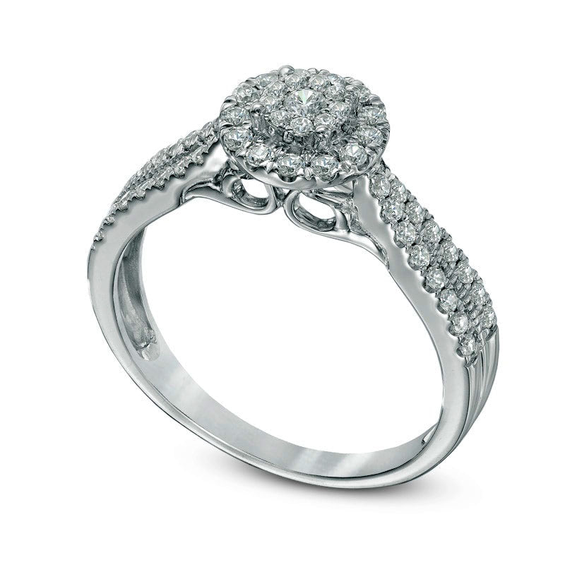 This stunning diamond engagement ring is sure to catch her eye and steal her heart. Made of durable 10K white gold, it boasts an elegant and timeless style that will never go out of fashion. The center features a dazzling diamond composite, encircled by a halo of sparkling diamonds that adds a trendy touch to the design. The shank is lined with a double row of accent diamonds, providing extra brilliance and completing the look with sophistication. With a comfort-fit design, this ring's beauty is enhanced with a shiny, polished finish. This gorgeous piece is set with 1/2 ct. t.w. of diamonds, making it the perfect choice to show how much you care.