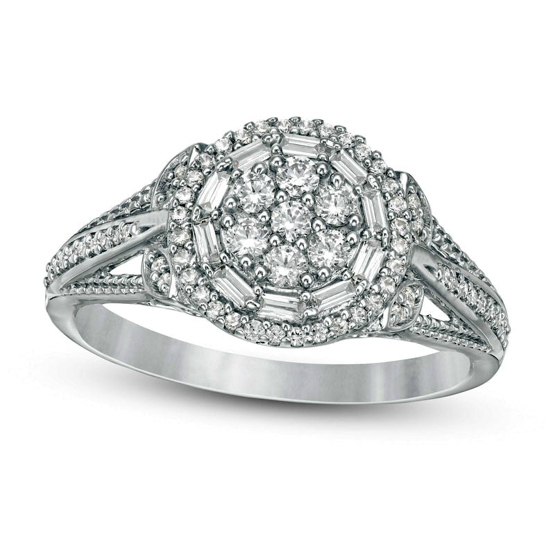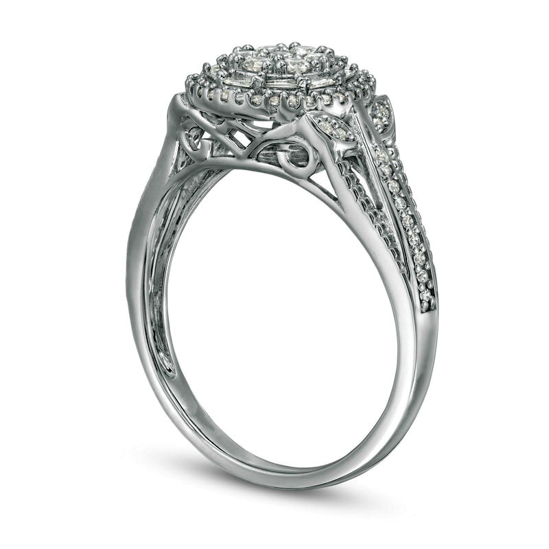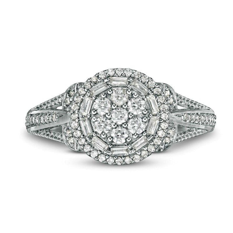This beautiful diamond engagement ring is made of sterling silver and has a total of 1/2 carat of diamonds. It has a unique design featuring a cluster of diamonds surrounded by two diamond frames, with diamond accents on the sides that look like flower petals. The band is split into three rows, with a line of diamonds in the middle, and intricate milgrain details on the edges. This ring cannot be resized after purchase, but it can be custom-made to fit your finger perfectly.