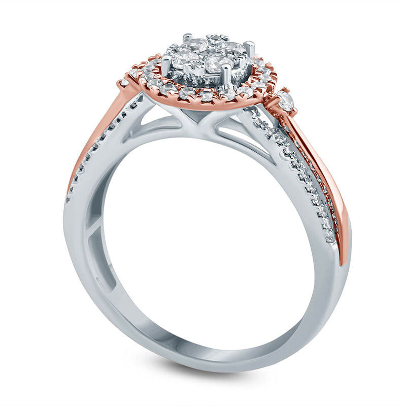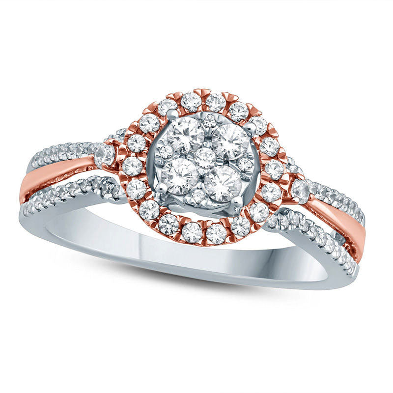 Impress your loved one with this stunning diamond engagement ring. It is crafted with 10K two-toned gold, featuring a magnificent round diamond composite in the center that is wrapped in a frame of diamonds in rose gold. The split shank is decorated with polished ribbons of rose gold that are complimented with a single diamond at the top, surrounded by rows of diamond-adorned white gold for a modern touch. This captivating piece offers 1/2 ct. t.w. of diamonds and a brilliant buffed luster, symbolizing the start of a beautiful journey together.