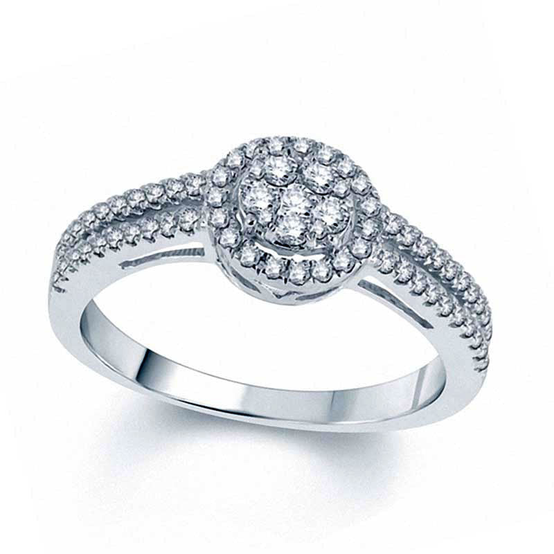 Inscribed with timeless elegance, this diamond engagement ring is a magnificent emblem of eternal love. Meticulously fashioned in glimmering 10K white gold, this ring is ornamented with a stunning flower-shaped cluster of sparkling round diamonds at its core. Encircling the center composite is a radiant halo of smaller round accent diamonds, which lavishly adorns the cluster in a dazzling embrace. A split shank, adorned with extra diamonds, exquisitely completes the ring's elegant design. With 1/2 ct. t.w. of diamonds and a refined polished finish, this remarkable ring is a magical token she'll cherish forever.