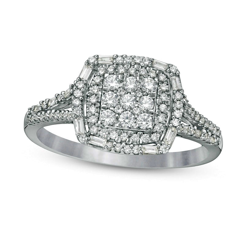 Looking for a diamond engagement ring that's both bold and modern? Look no further than this stunning piece in sterling silver. Crafted with a square-cut composite of round diamonds wrapped in cushion-shaped frames of both round and baguette-cut diamonds, this ring exudes elegance and sophistication. Meanwhile, the shank features a striking arrangement of both round and baguette-cut diamonds, making this ring truly sparkle. With a total weight of 1/2 ct. t.w., this engagement ring is sure to be a lasting symbol of your unique love story. Please note that sterling silver rings cannot be resized after purchase.