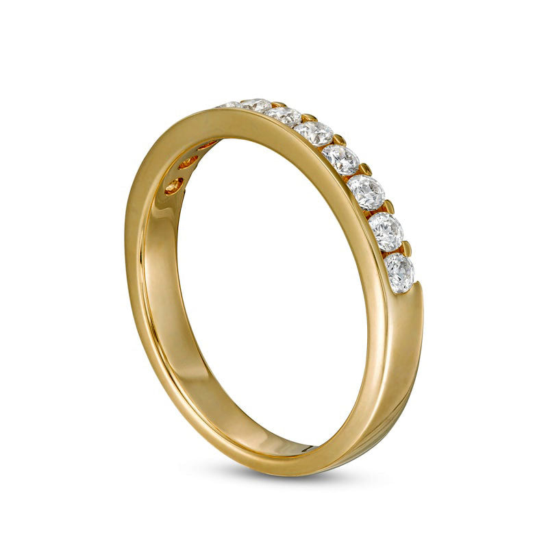 Enhance your bridal ensemble with this exquisite 14K gold diamond anniversary band. This stunning piece features a row of prong-set diamonds flanked by a sleek, polished ribbon on one side, for a look that is both elegant and modern. The shank of the ring has been rounded for optimal comfort throughout the day. Boasting a 1/2 carat total weight of diamonds and a radiant polished finish, this ring is the perfect complement to your individual style. Add a touch of brilliance to your special day with this captivating diamond band.