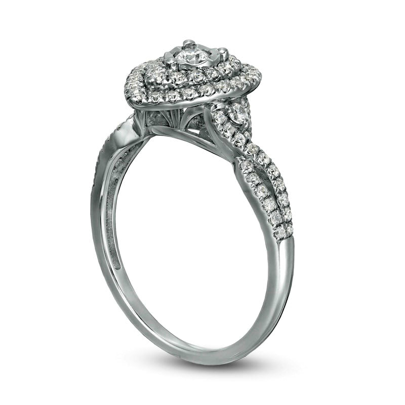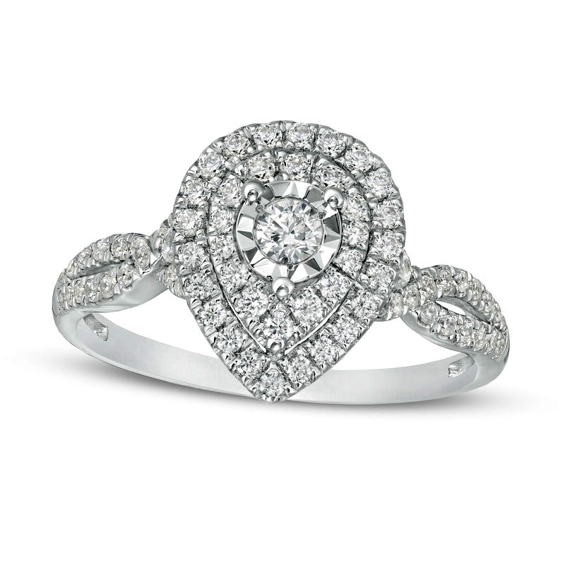 Propose to your loved one with this stunning diamond engagement ring. Made in 10K white gold, this contemporary style features a 1/15 ct. diamond that is expertly placed to maximize its size and shine. A double teardrop-shaped frame of diamonds surrounds the center stone, and additional diamonds adorn the twist ribbons of the split shank. With a total diamond weight of 1/2 ct. and a polished finish, this engagement ring will make your proposal a truly magical moment.