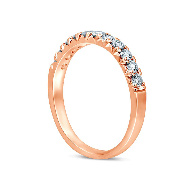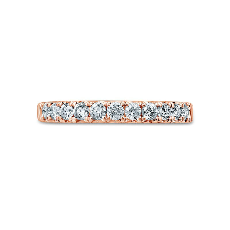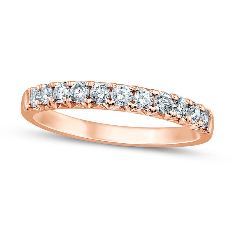 Celebrate your love with this elegant diamond anniversary band, perfect for any milestone. Crafted from luxurious 14K rose gold, this band features eleven dazzling 1/20 ct. diamonds, for a total of 1/2 ct. t.w. On your special day, this ring will radiate beauty and sparkle with a brilliant buffed luster. With many more wonderful years to come, this band is a beautiful and lasting symbol of your enduring love.