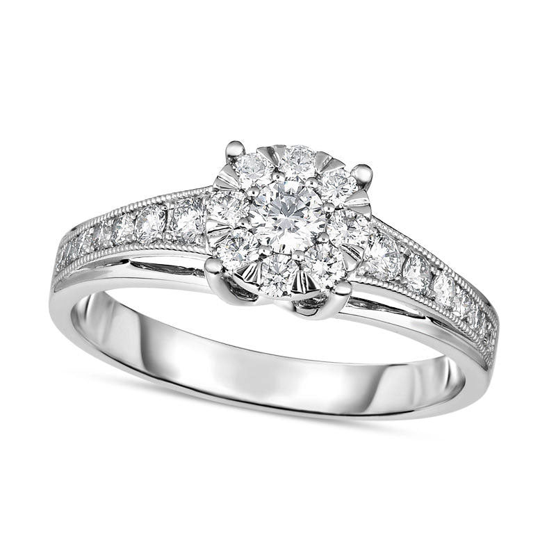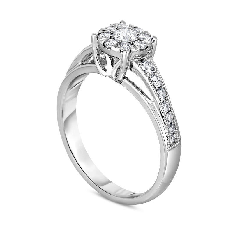 This beautiful engagement ring is a special symbol of love that will be cherished for a long time. It is made from shiny 10K white gold and has a pretty design with a 1/8 ct. diamond in the center, surrounded by smaller diamonds. The band also has diamonds and intricate details that give it an old-fashioned feel. Overall, the ring has 1/2 ct. t.w. of diamonds and a polished shine. It's a charming way to show your love to someone special.