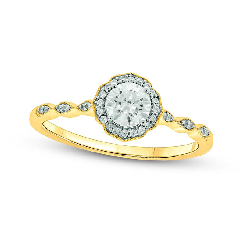 This vintage-style diamond engagement ring in 10K gold is a perfect symbol of your everlasting love. A stunning 3/8 ct. diamond is beautifully held in a milgrain-detailed frame of petal...