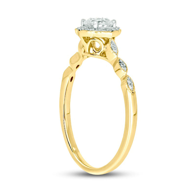 This vintage-style diamond engagement ring in 10K gold is a perfect symbol of your everlasting love. A stunning 3/8 ct. diamond is beautifully held in a milgrain-detailed frame of petal shapes adorned with diamonds. The shank is decorated with marquise shapes that sparkle with diamonds and milgrain borders. With a total weight of 1/2 ct. t.w. diamonds, this engagement ring shines with radiance and adds a touch of sweetness to your special moment. The ring comes in a bright polished finish, making it a beautiful statement piece for your loved one's finger.