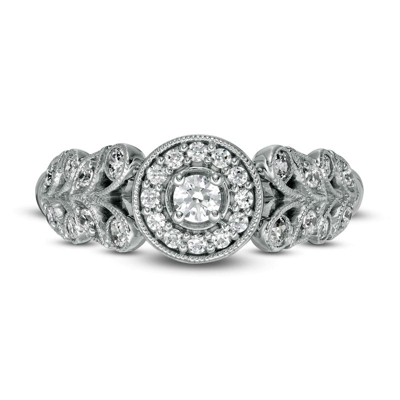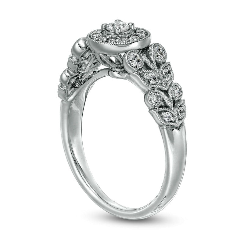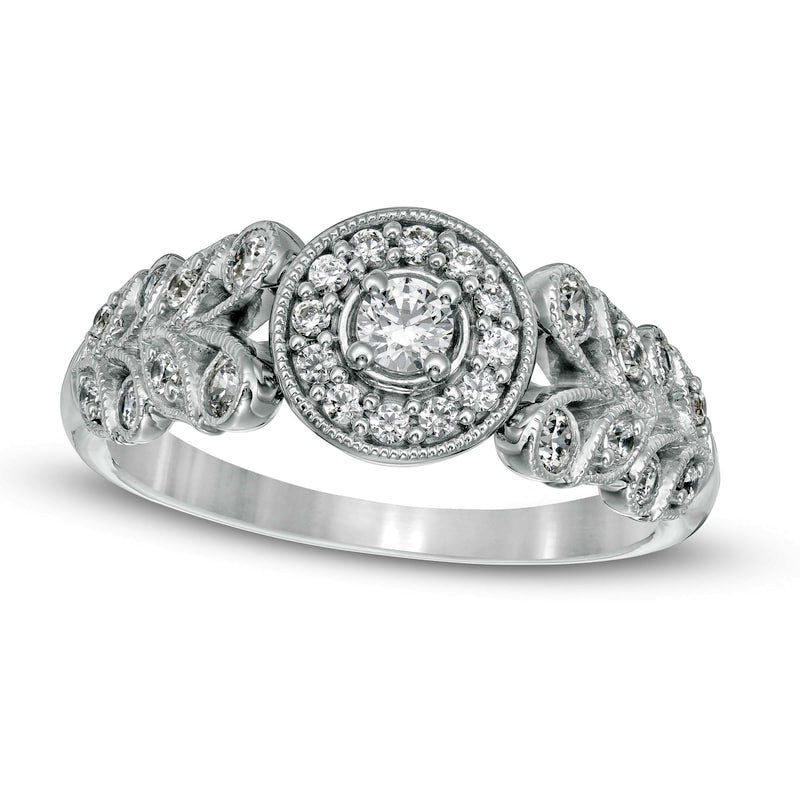 Experience the whimsical beauty of this vintage-style diamond engagement ring, perfect for the romantic at heart. Crafted in elegant 10K white gold, this stunning piece features an exquisite 1/10 ct. diamond encircled by a sparkling frame of dazzling diamonds and delicate milgrain detailing. The sculpted shank of the ring is adorned with additional diamonds, arranged in a charming motif of leaf shapes with intricate milgrain accents. With an impressive total diamond weight of 1/2 ct. and a radiant polished finish, this enchanting engagement ring is a truly captivating symbol of your everlasting love.