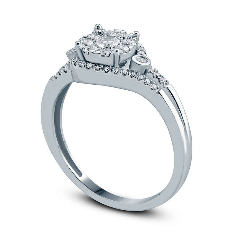 This beautiful engagement ring is made of shiny 10K white gold and has lots of diamonds on it - a total of half a carat worth! There's one big diamond at the center, surrounded by lots of little diamonds in a round shape. On each side, there's another sparkly diamond. The band of the ring splits in two and wraps around the center diamond in a swirl. This ring is sure to make your loved one very happy!