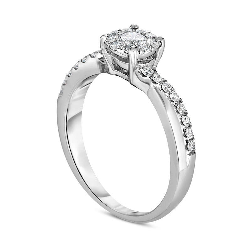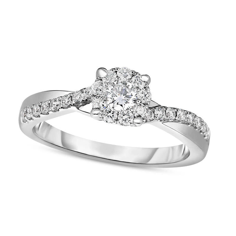 Impress your beloved with this striking engagement ring adorned with diamonds. Crafted from 10K white gold, this exquisite design highlights a 1/6 ct. central diamond that is surrounded by a cluster of smaller diamonds. The polished shank showcases a ribbon of diamonds that curves and twists to create an alluring bypass effect. With a total weight of 1/2 ct. t.w. of diamonds and a brilliant, polished finish, this engagement ring is a fashion statement that exudes glamour and charm.