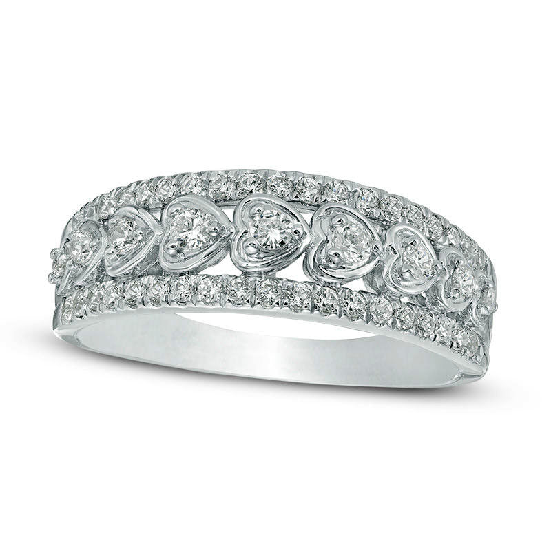This stunning diamond anniversary band is the ultimate expression of love. Beautifully crafted in luxurious 14K white gold, it exudes elegance and romance. The piece boasts sparkling round diamonds that are delicately nestled in polished heart-shaped frames. The heart-shaped diamonds are surrounded by smaller diamonds, which add to their brilliance and shine. With a total diamond weight of 1/2 ct. t.w., this nine-stone anniversary band is truly exquisite. Its bright, polished finish further enhances its already gorgeous appearance. A daily reminder of your love, this band is a timeless and treasured piece that she'll cherish for years to come.