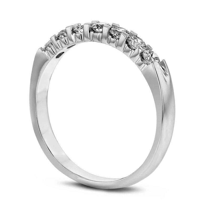 Mark a significant milestone in your relationship with this stunning diamond anniversary band. Fashioned in elegant 14K white gold, this intricately crafted ring showcases a glimmering strand of 1/15 ct. diamonds. With an enchanting total weight of 1/2 ct. of diamonds and a captivating polished finish, this seven-stone anniversary band perfectly represents your enduring love story. Let it be a beautiful testament to your cherished memories and future filled with love.