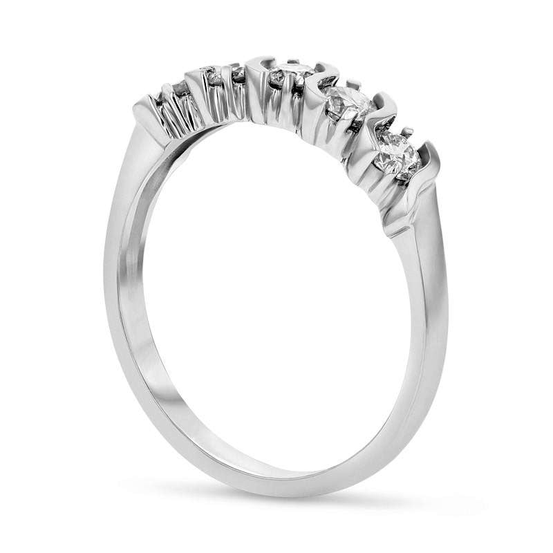 Commemorate your anniversary or any special moment with this stunning diamond ring, featuring a unique and sophisticated design. Perfectly crafted in 14K white gold, this ring showcases five dazzling round diamonds that are held in place by elegant prongs on the polished shank. Each diamond is accentuated by intricate "S"-shaped details that gently embrace the stone, creating a breathtaking effect. With a total weight of 1/2 ct. t.w. of diamonds, this ring sparkles with unparalleled brilliance and will be treasured forever by its lucky recipient.