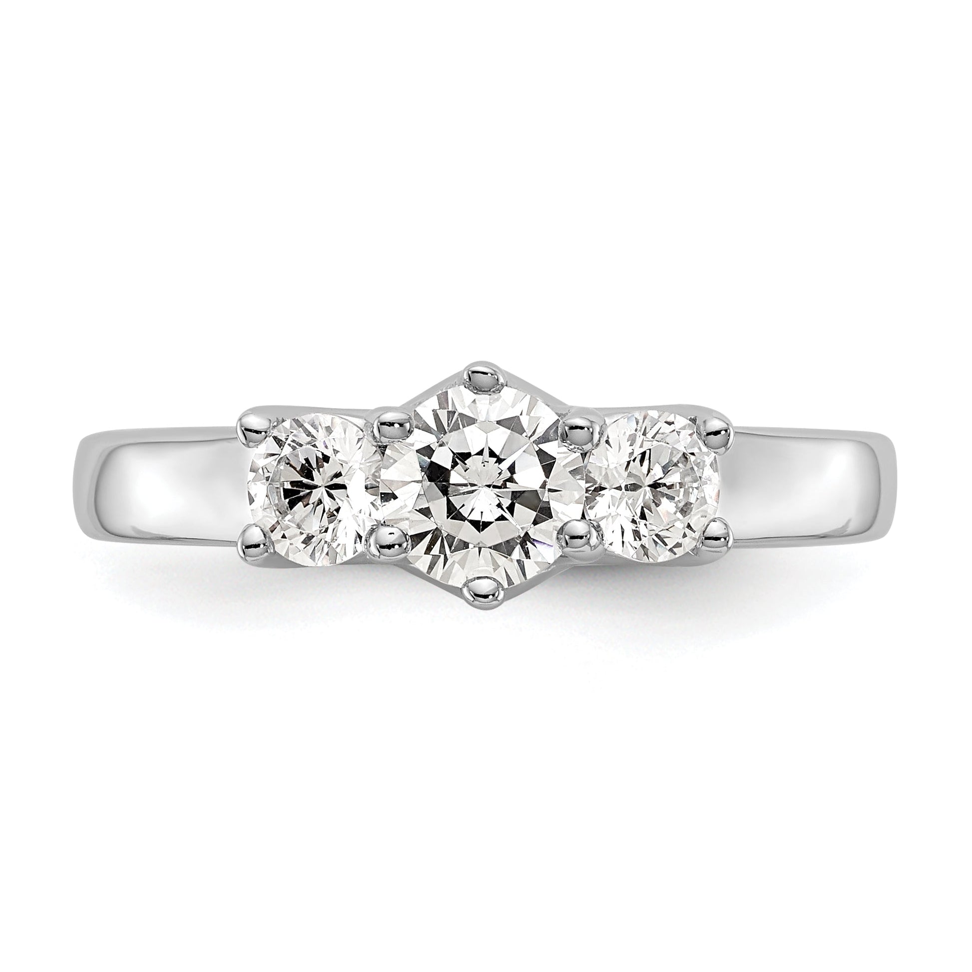 This stunning engagement ring boasts a 0.50 carat AAA quality cubic zirconia set in solid real 14K white gold. The gold is stamped with 14K authenticity, promising exceptional quality that won't oxidize or discolor. The ring features a 3-stone design with the center CZ stone weighing 0.45 carats and the two side stones weighing 0.24 carats combined. The ring is polished to a high shine and the stones are set by our experienced jewelers. Upgrade to natural diamonds is available upon request. This ring arrives ready to gift in a complimentary gift box and comes with a 30-day, hassle-free, money-back guarantee. It's perfect for engagements, weddings, anniversaries, or just to say "I love you". The ring is half-round in shape and the band width tapers from 2.9 to 3.4 mm. The head height is 6.96 mm, and the ring top length is 6.39 mm while the ring top width is 12.95 mm.