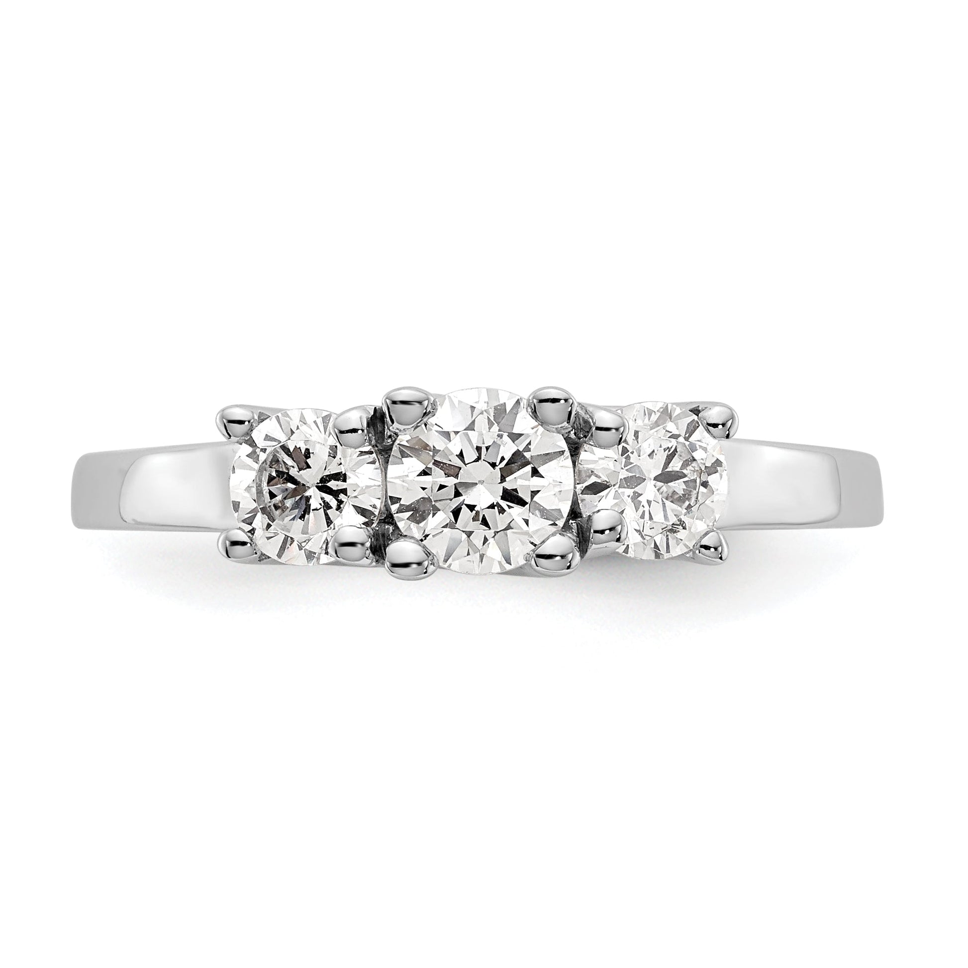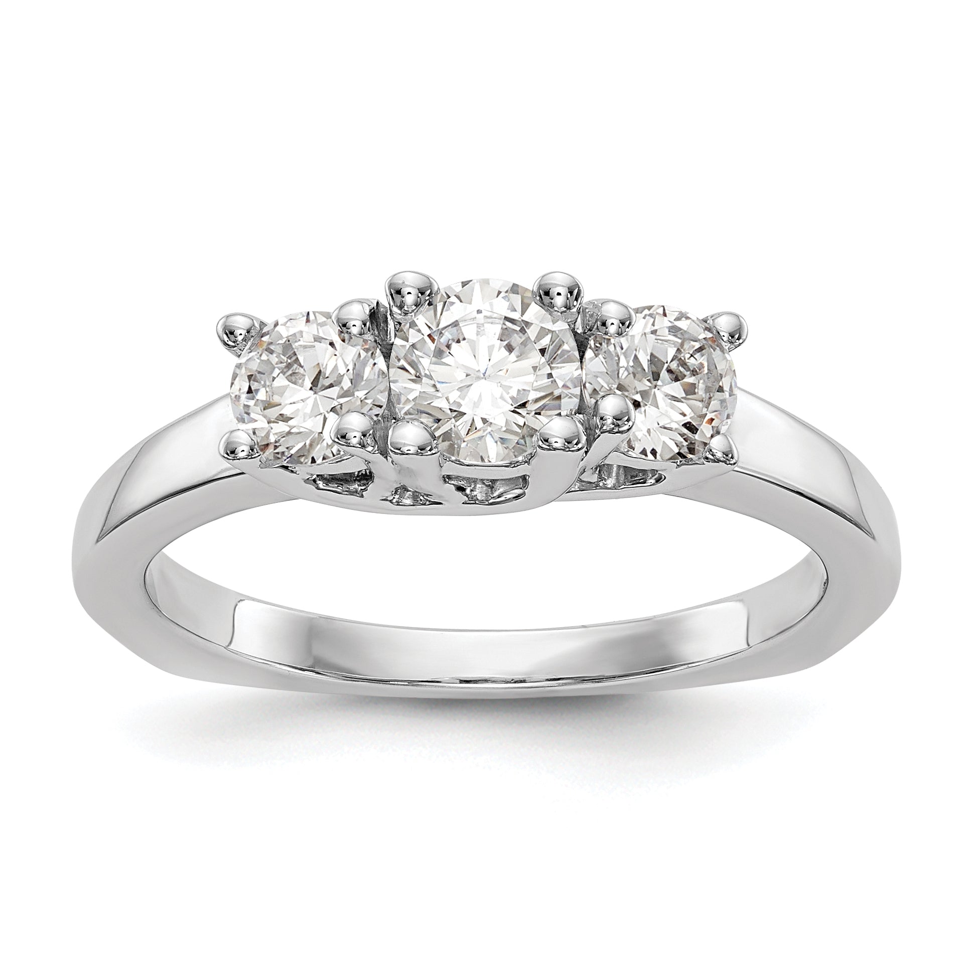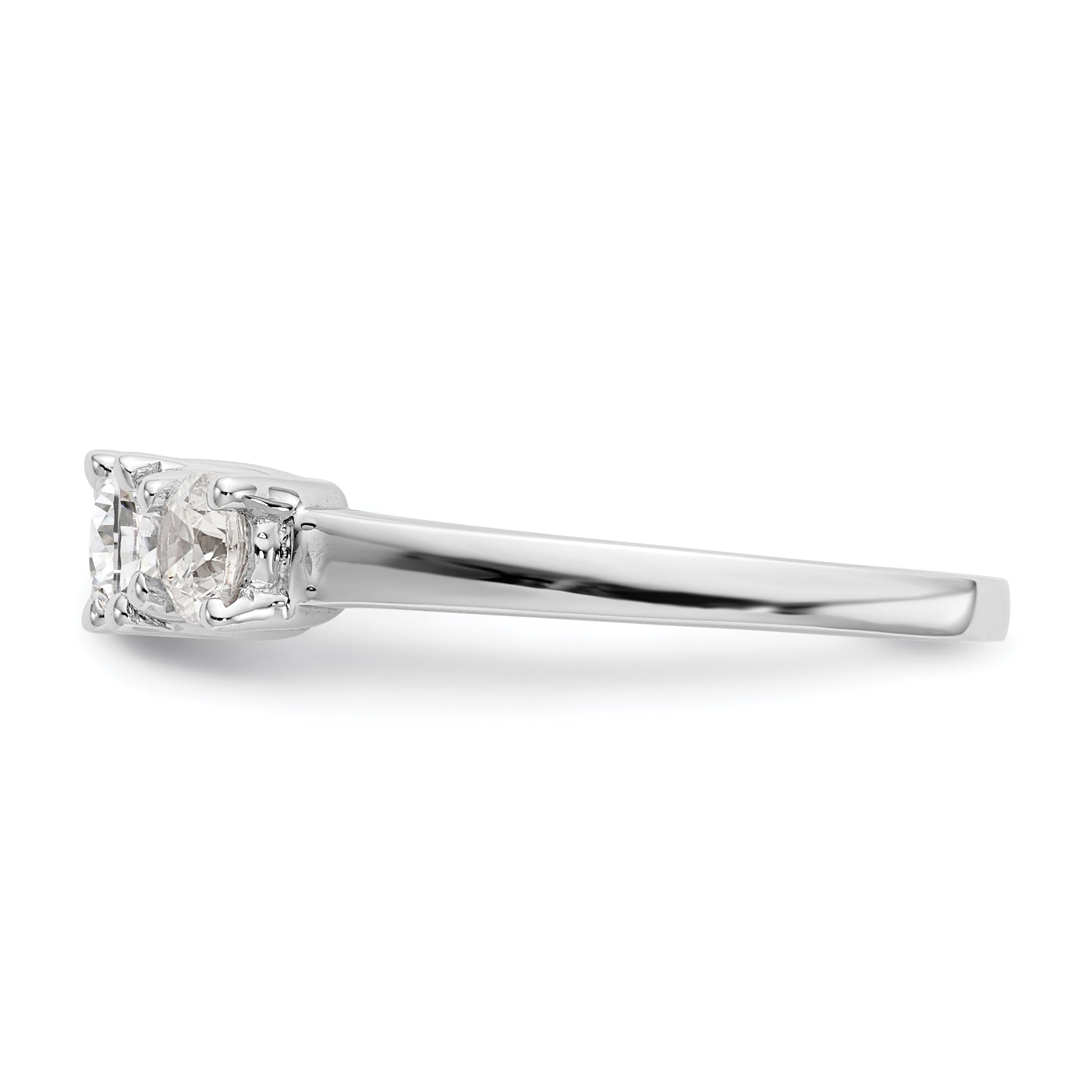Gift your loved one an incredible engagement ring with this stunning '0.50ct. CZ Solid Real 14K White Gold 3-Stone Engagement Ring'. Crafted in real 14k white gold, its authenticity is stamped with a 14K symbol for exceptional quality. The gold won't oxidize or discolor, and the AAA quality cubic zirconia stones are hand-set and high-polished by experienced jewelers. You can even upgrade to real diamonds for an additional cost by contacting us. Perfect for any occasion, this ring is fit for birthdays, anniversaries, Valentine's Day, weddings, Mother's Day and more. This vacation-safe ring is also an ideal everyday, promise or vacation ring. You can always feel confident in your purchase with our 30-day, hassle-free, money-back guarantee. Further, our USA-based company prides itself on superior customer service. The rhodium plating highlights the polished finish of the ring, which features tapered band width ranging from 1.9 to 2.5mm. It flaunts a head height of 6.15mm and is semi-mount, with an open back and a rocker shank ring shape. The ring top length is 4.89mm and width 13.14mm with a flat edge type. You can choose the size from 6 (minimum) to 8 (maximum) in 0.25 increments. With a total weight of 0.50ct, the ring features four round, faceted and synthetic cubic zirconia stones of 2.5mm each. The center stone mounting has an April birthstone month, sits on a 4 prong round head type, and has a grade of G-I with the side stones of G-H-I grade. This elegant engagement ring is sure to turn heads and will come ready-to-gift with a complimentary gift box.