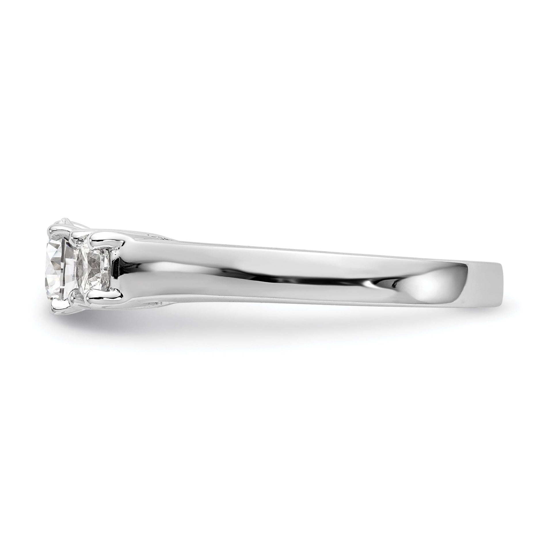 Featuring a polished finish, rhodium plating, and a rounded edge design, this exquisite ring has a 2.71 to 3.39 mm tapered band providing extra comfort for your finger. The mounting is casted with a closed back and is sizeable. The center stone mounting weighs 0.5 ct and is round shaped, while the side stone mounting weighs 0.24 ct and is also round shaped. The product type is jewelry mountings and it is sold individually.