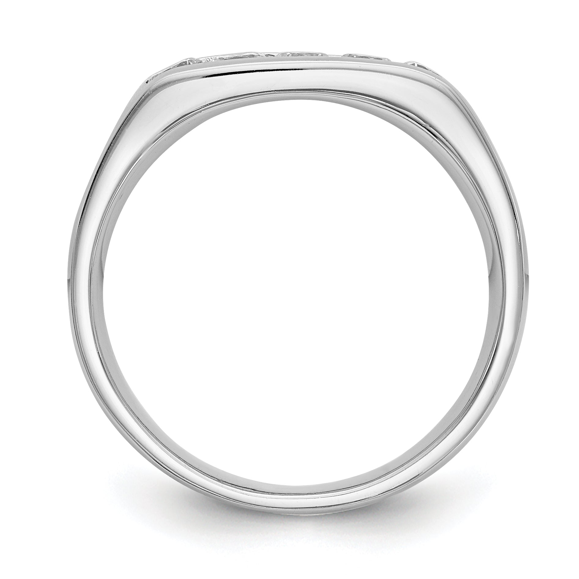 This high-quality ring is accompanied by a 30-day, hassle-free, money-back guarantee and arrives with a complimentary gift box. If for any reason you're not happy with your purchase, please contact us directly for superior customer service. The ring features a polished finish, five stone mountings, and a tapered band width of 5.5 to 4mm. The stones have a weight of 0.1 ct and a round shape measuring 2.9mm. The ring is not recommended to be engraved and is sold by the unit. The ring also features a closed back and is perfect for any wedding band or engagement ring.