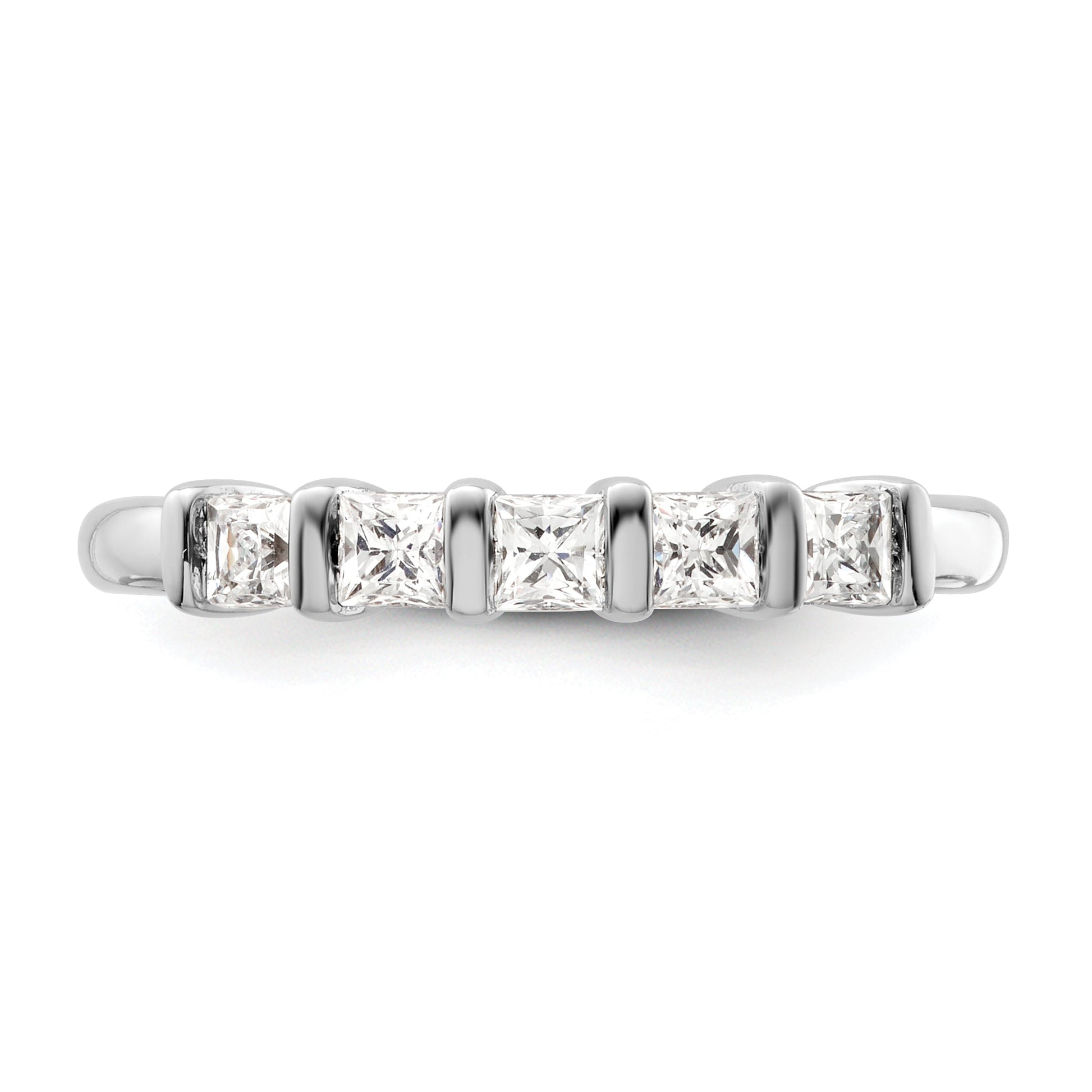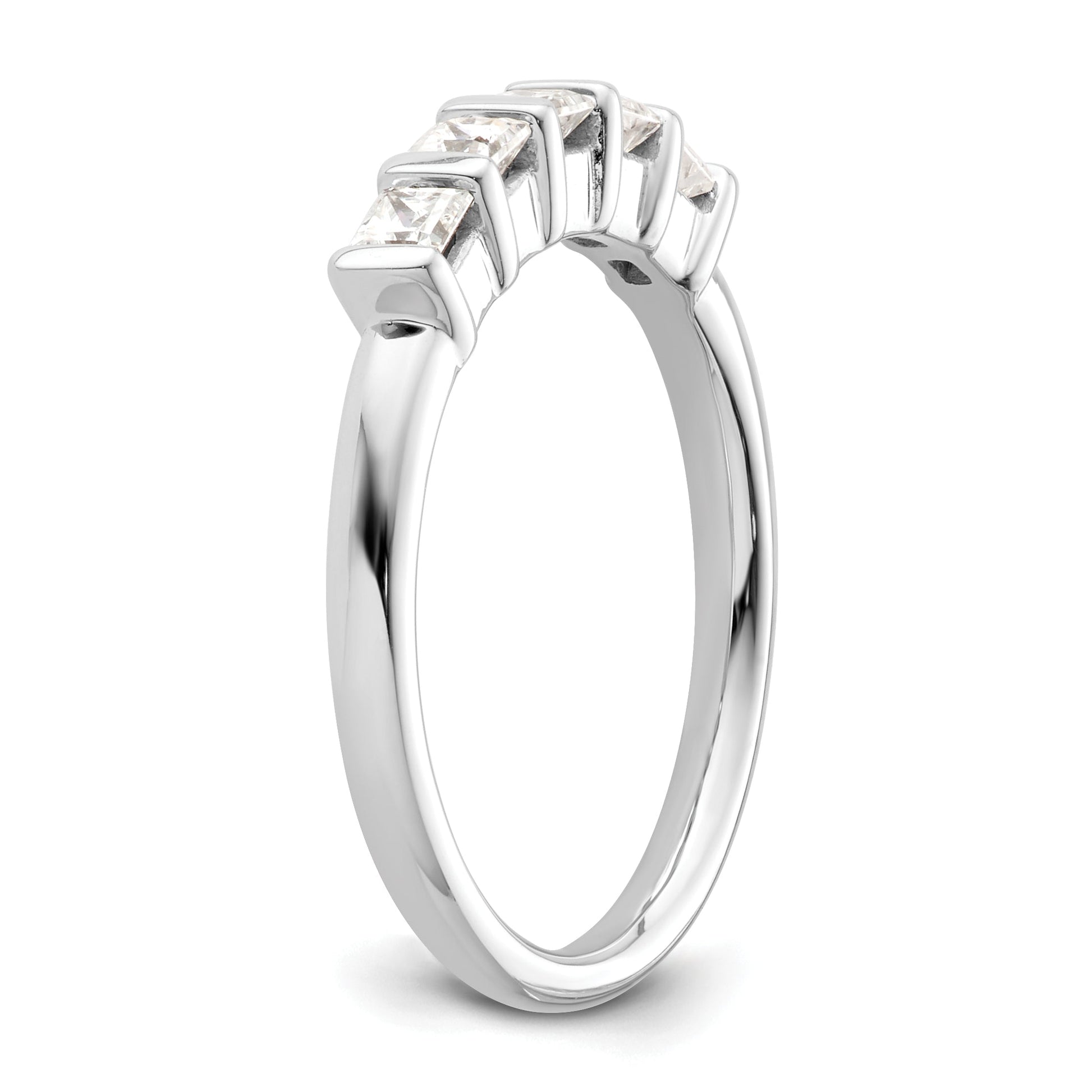 The '0.50ct. CZ Solid Real 14K White Gold 5-Stone Wedding Band Ring' is a high-quality piece of jewelry made from genuine 14K white gold. It features AAA quality cubic zirconia, which are hand-set by experienced jewelers. The ring is also available with natural diamonds. It comes with a 30-day money-back guarantee and arrives in a complimentary gift box. The band width tapers from 2.6 to 1.8 mm, and the ring can be sized between 6 and 8.