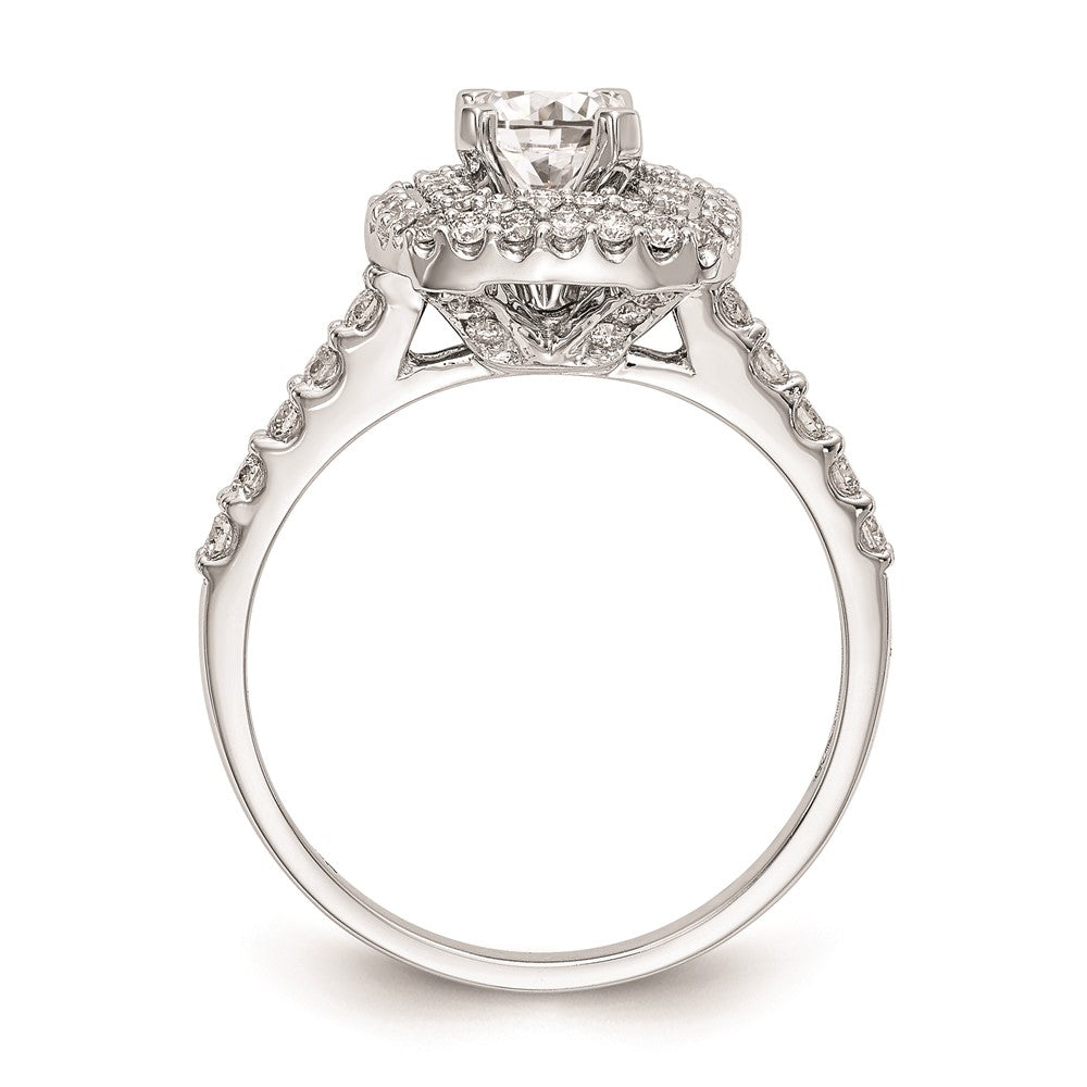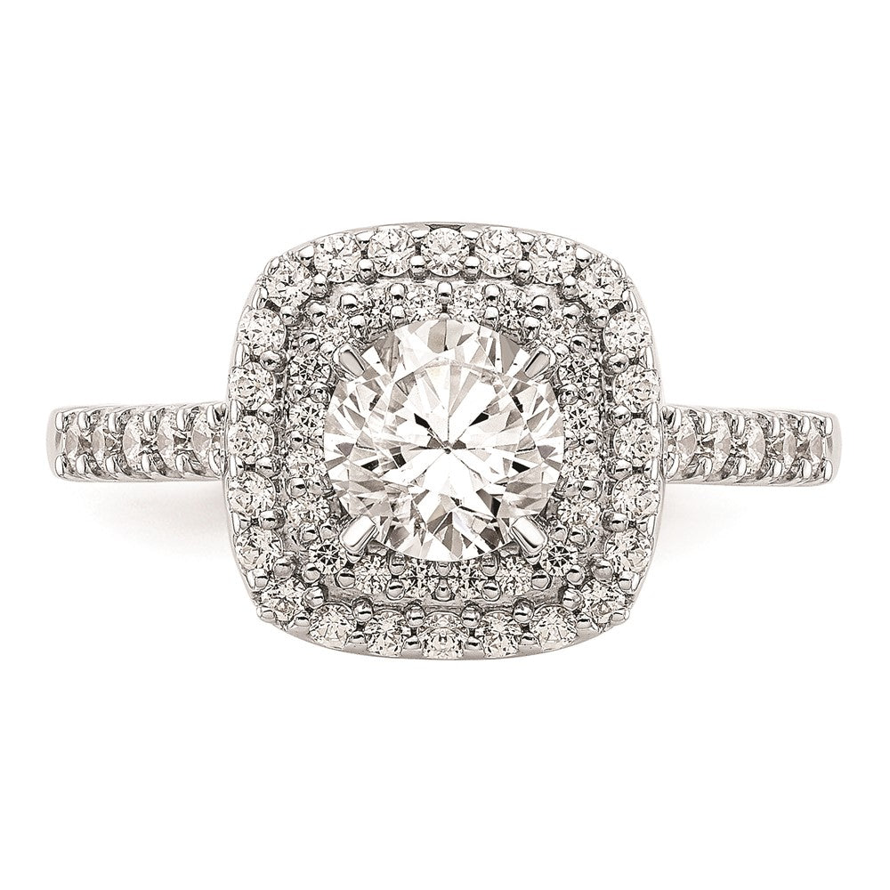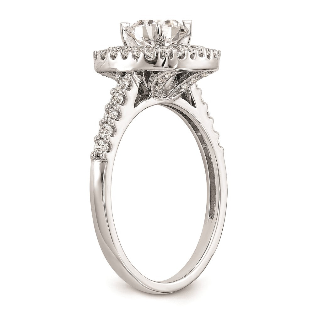 This engagement ring features a fancy undercarriage and a polished finish, with a band width of 2mm. The center stone mounting measures 6mm in diameter, while the smaller CZ stones range in size from 0.9mm to 1.5mm. The ring is available in sizes 6 to 8, and can be adjusted incrementally by 0.25.
