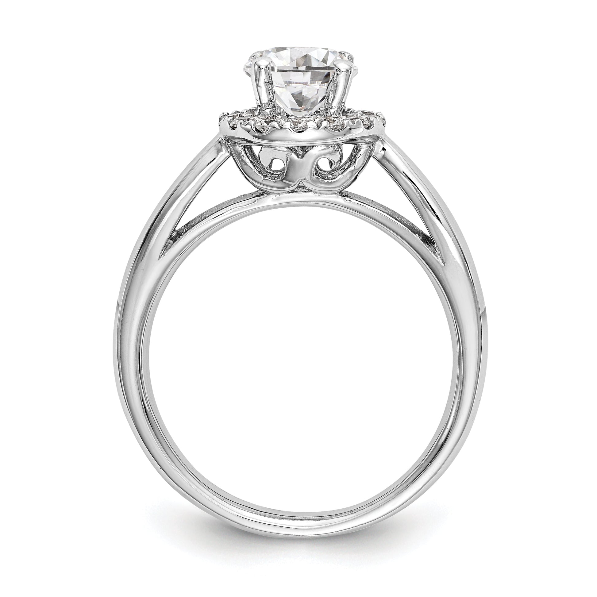 This real 14K gold ring features a polished finish and a round halo design, with a center stone mounting and 12 surrounding CZ stones. It's rhodium plated to prevent oxidation and discoloration, ensuring your ring will last for years to come. The center stone weight is 0.475 ct and the smaller stones weigh 0.015 ct each, with a clarity of I1 (AA). This ring can be sized from 6-8, with adjustments in increments of 0.25. It's a semi-mount ring, meaning the center stone is not included, and is sold individually. The stone shapes are both round, with the center stone measuring 5.1mm and the smaller stones measuring 1.5mm. Shop with confidence and fall in love with our 0.50ct CZ Solid Real 14K White Gold Round Halo Engagement Ring.