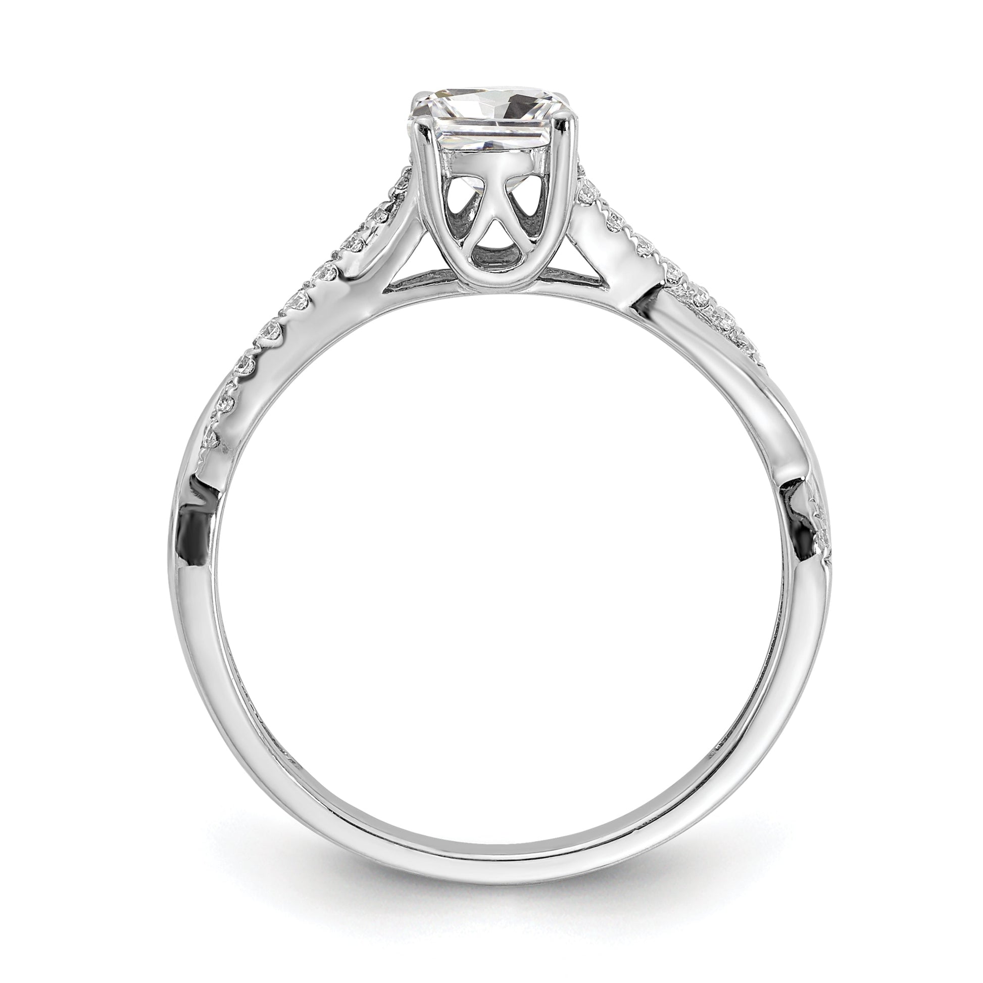 The band is tapered at 3.2 mm to 1.8 mm and the head height is 6.1 mm. The ring is semi-mount, which means that it does not include center stones. However, it is sizeable and has a thickness of less than 1.5 mm. This engagement ring is polished with rhodium plating, has a round head with four prongs, and is white in color. The ring top measures 5.2 mm in length and width and boasts a beautiful twist design.