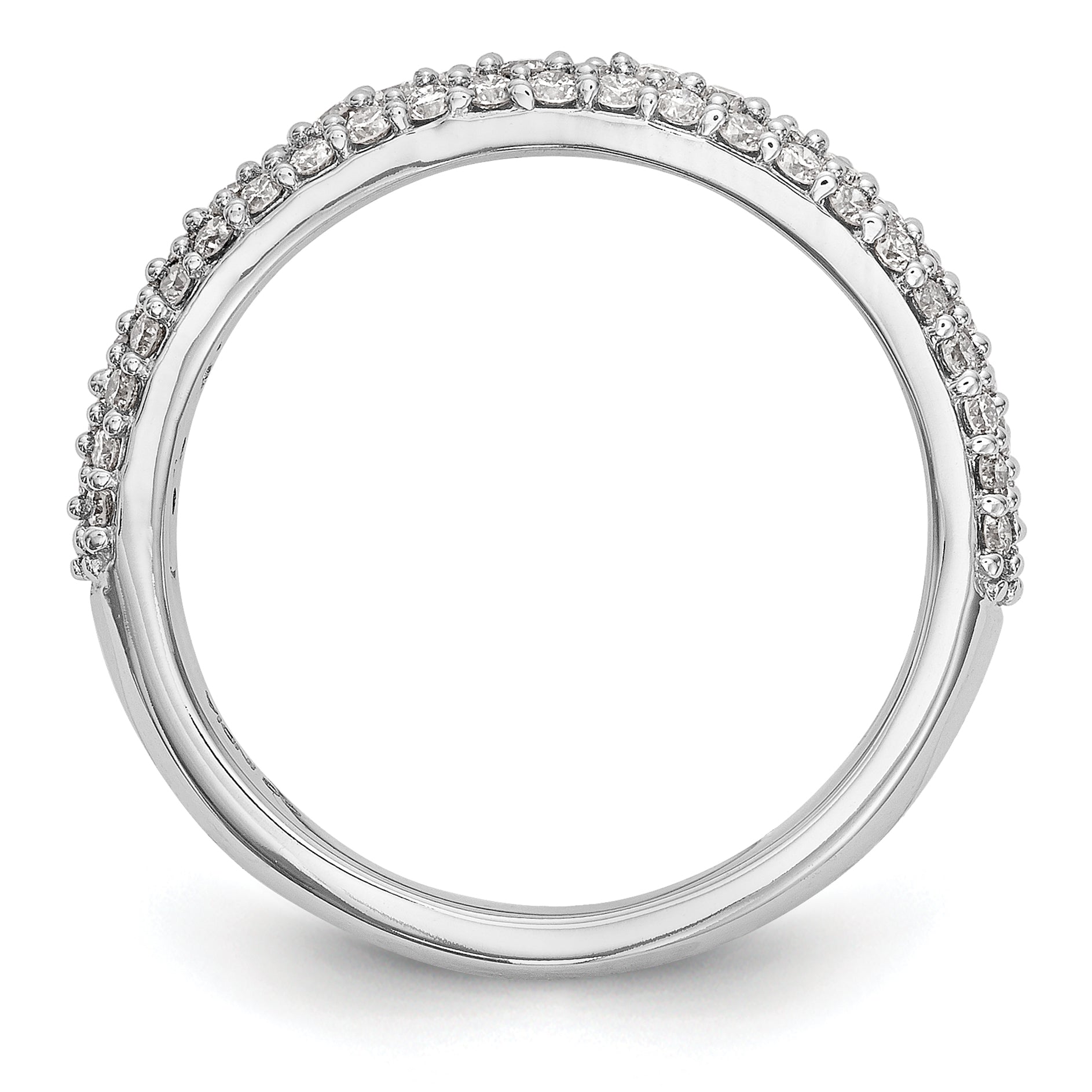 This stunning ring has 70 round cut CZ stones with a total weight of 0.56ct, and is finished with a polished rhodium plating. It has a tapered band width ranging from 3.5 to 3.3mm, and is sizeable for a perfect fit. With a complete inclusivity of all stones and a thickness less than 1.5mm, this ring is not recommended for engraving. Sold individually, this jewelry piece is perfect for anyone looking for a stunning wedding band ring that features synthetic stone creation methods.