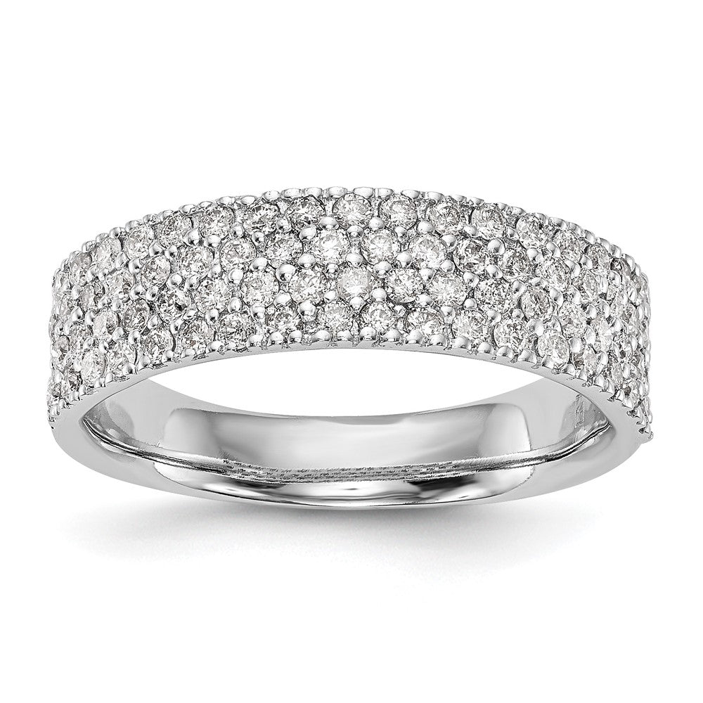 This ring has a polished finish and features 12 round-shaped CZ stones weighing 0.01ct and 60 round-shaped CZ stones weighing 0.008ct, with a clarity of I1 (AA). The band width ranges from 5.3 to 3.1 mm (tapered) and is plated with Rhodium. The ring is complete with all stones included and is sizeable up to size 8 in increments of 0.25. It is not recommended for engraving, and its primary color is white. It is a perfect ring for a wedding band or an everyday elegant piece of jewelry.