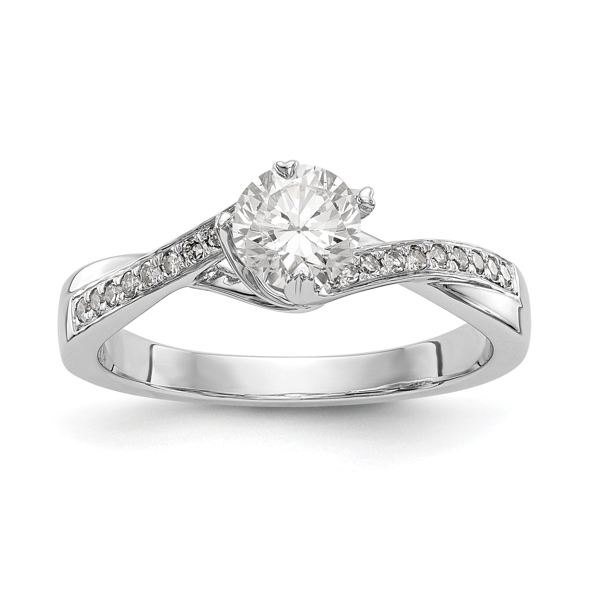 Beautifully set in sparkling diamonds, a 1/2 ct. natural and earth mined round diamond commands attention in the lovely engagement ring of this engagement ring. A single by passing row of additional round diamonds line the 14K white gold band to complete the look.