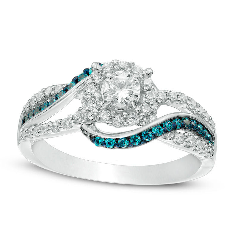 This stunning diamond engagement ring is sure to take your partner's breath away. Crafted from sleek 10K white gold, the exquisite design features a dazzling 1/5 ct. white diamond center stone encircled by a halo of diamonds. Twisting ribbons of mesmerizing enhanced blue and more white diamonds elegantly weave in and out of the center, culminating in a split shank that adds a touch of drama to the piece. Boasting a total diamond weight of 5/8 ct. and a luminous polished finish, this ring is a magnificent and unforgettable choice.