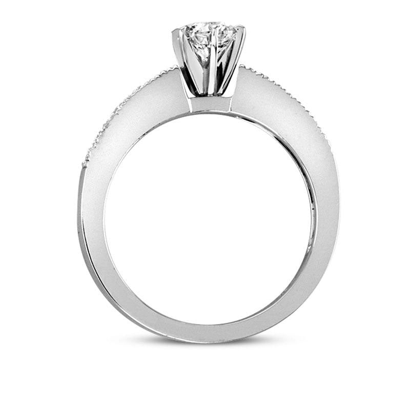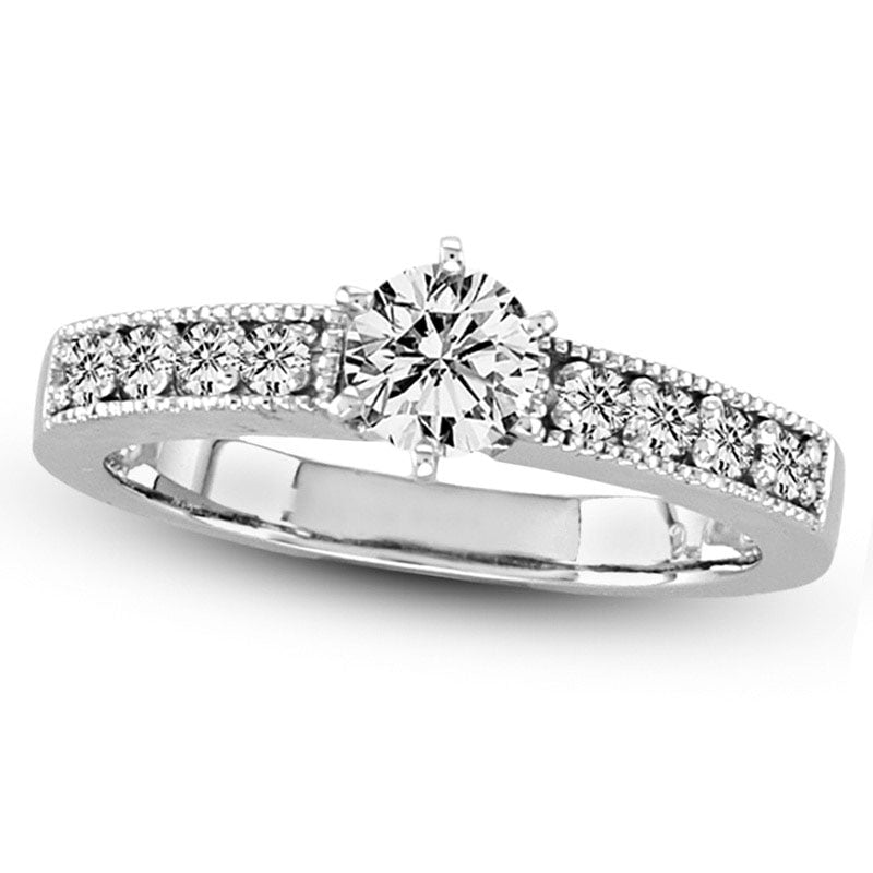 This stunning vintage-style diamond engagement ring is the perfect way to express your love and devotion. Made from 14K white gold, the captivating ring features a striking 1/2 ct. round diamond center stone beautifully displayed in a classic six-prong setting. The shank boasts sophisticated milgrain detailing and glistens with a series of smaller round accent diamonds. With an heirloom feel, this engagement ring is both elegant and timeless and boasts a total of 5/8 ct. t.w. of sparkling diamonds that glitter with a polished shine. This heartfelt piece is sure to take her breath away.