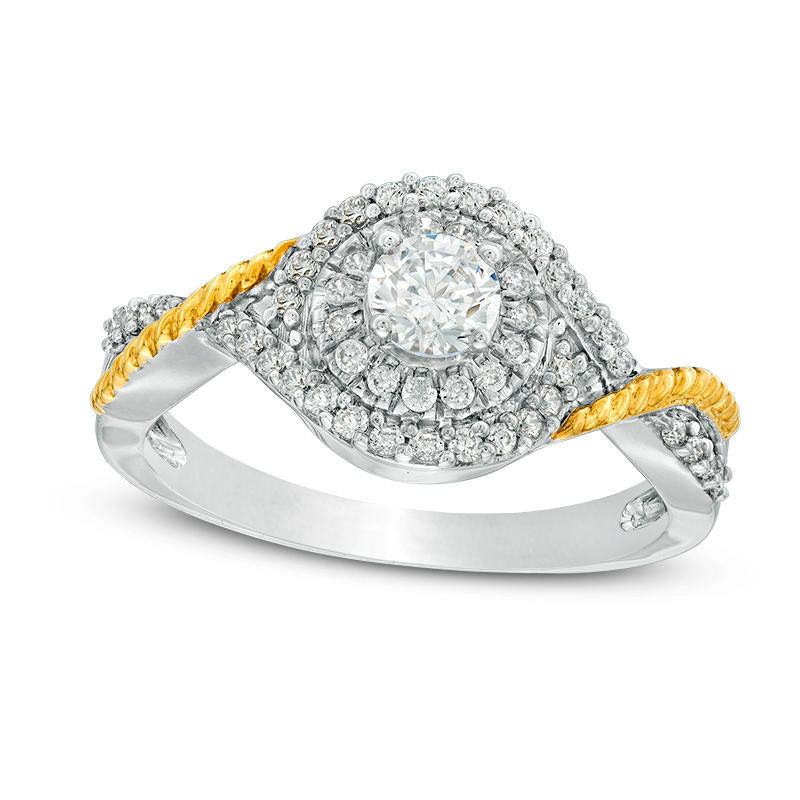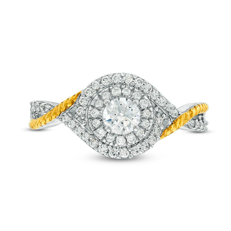 For an unforgettable engagement, choose this exquisite diamond ring. Expertly crafted in 14K two-tone gold, this stunning piece boasts a white gold band that wraps around a mesmerizing 1/3 ct. diamond, encircled by a halo of diamonds. The split shank is beautifully designed with one row of textured yellow gold and another row of diamonds and white gold that bypasses the centerpiece, creating a dazzling effect. With a total weight of 5/8 ct. t.w., this ring is sure to catch everyone's eye. The exceptional quality of this ring's craftsmanship is matched only by its radiance, making it the perfect symbol of your love.