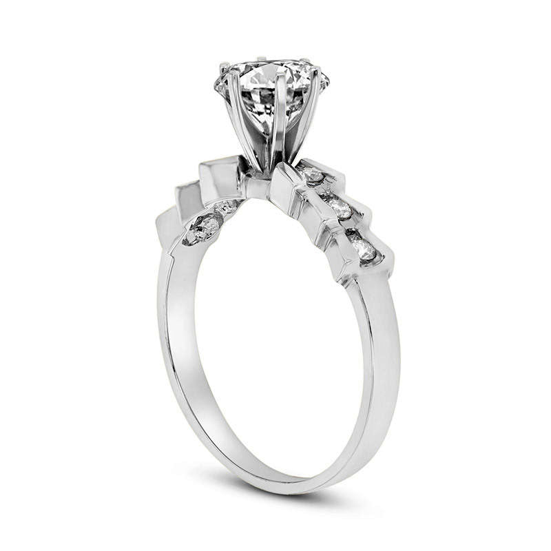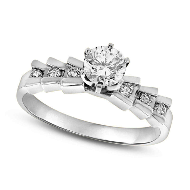 This stunning diamond engagement ring is the perfect choice for the modern bride with exceptional taste. Made from premium 14K white gold, the ring features a breathtaking 1/2 ct. diamond centerpiece secured by six sturdy prongs. The fashion-forward design boasts channel-set diamonds in arrow-shaped frames cascading down the shank, adding an extra touch of sophistication. All diamonds in this ring have an impressive color grade of I and clarity grade of SI2. With a total diamond weight of 5/8 ct. and a smooth polished finish, this engagement ring is an exquisite piece that she will treasure for a lifetime.