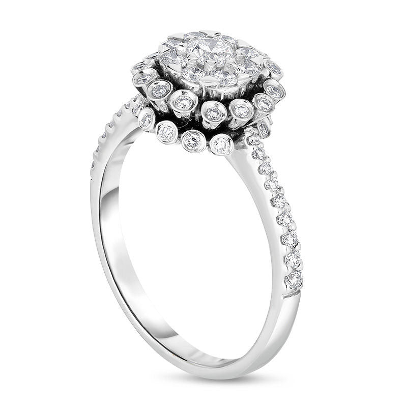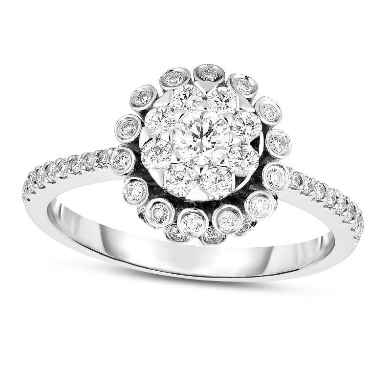 This stunning engagement ring is a beautiful representation of elegance and sophistication. Crafted in 14K white gold, the intricate design boasts a flower-shaped composite of diamonds, featuring a 1/6 ct. diamond at the center. Two rows of diamonds, set in unique half-bezel settings, create a dazzling frame around the bloom, while additional diamonds line the slender shank for extra sparkle. With a total weight of 5/8 ct. t.w., this engagement ring is truly one-of-a-kind and radiates a brilliant luster that will take your breath away.