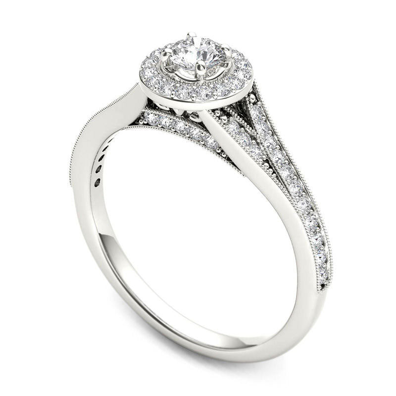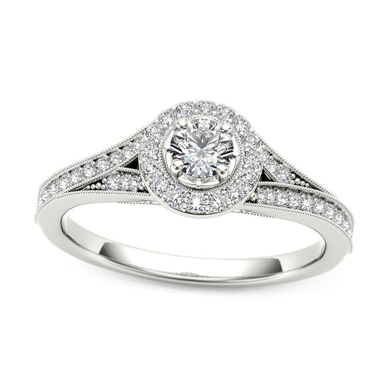 This stunning vintage-style diamond engagement ring is sure to captivate her heart. The 14K white gold setting perfectly highlights the 1/3 ct. center diamond, which is embraced by a round diamond-lined frame for added sparkle. The intricate milgrain detailing along the top and sides of the dramatic split shank design creates a dazzling effect from every angle. Totaling 5/8 ct. t.w., this ring exudes the timeless elegance of an heirloom piece and is sure to leave a lasting impression.